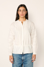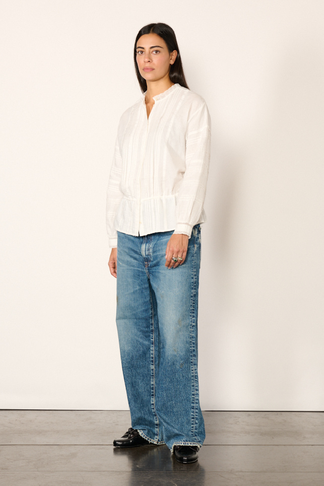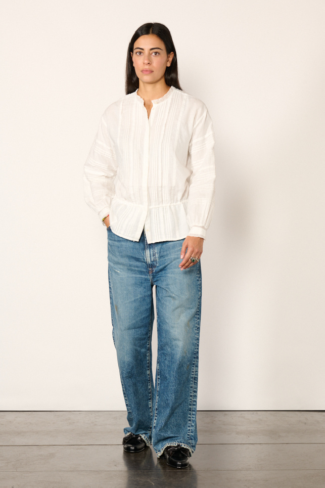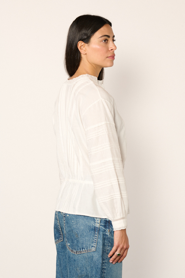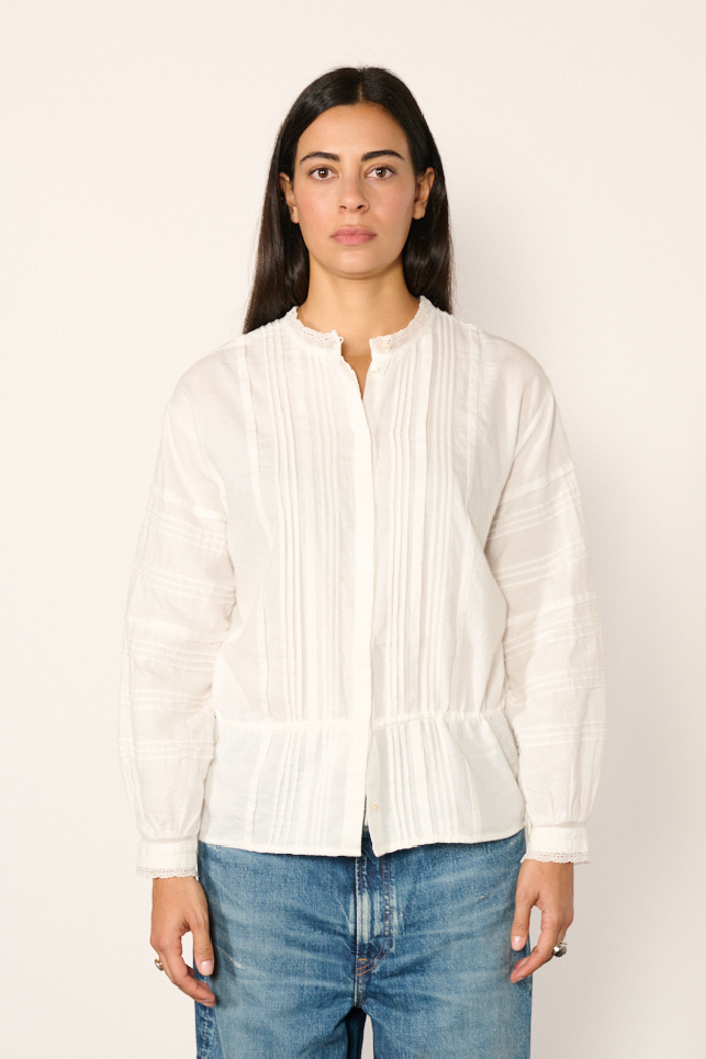 Délicatement orné de plis fin, il se distingue par une patte de boutonnage invisible, ainsi q’un col et des poignets boutonnés agrémentés de fine dentelle.