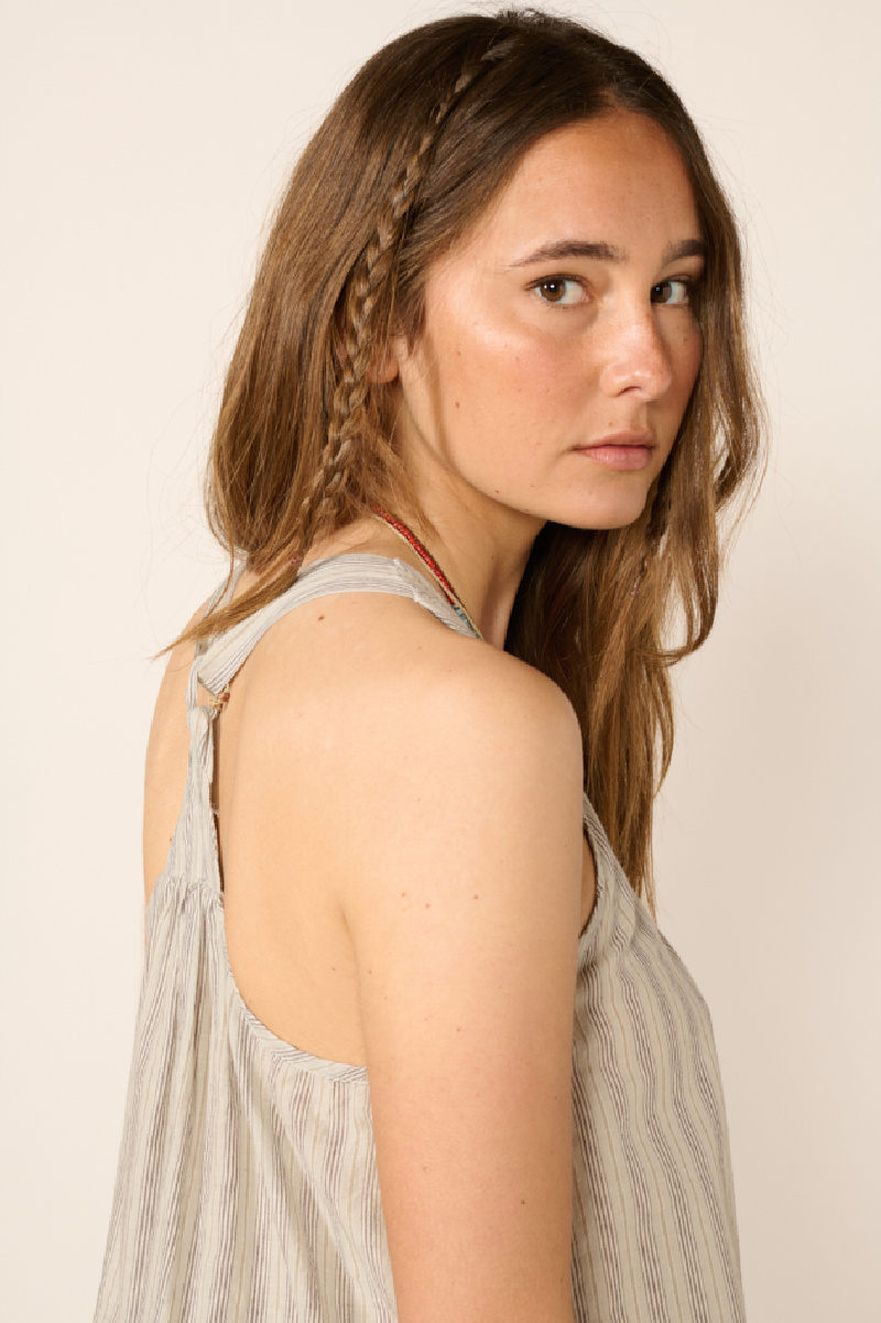 Top confectionné en voile de coton khadi rayé dans les tons naturels bleu/gris, tissée à la main, de la marque BSBEE.