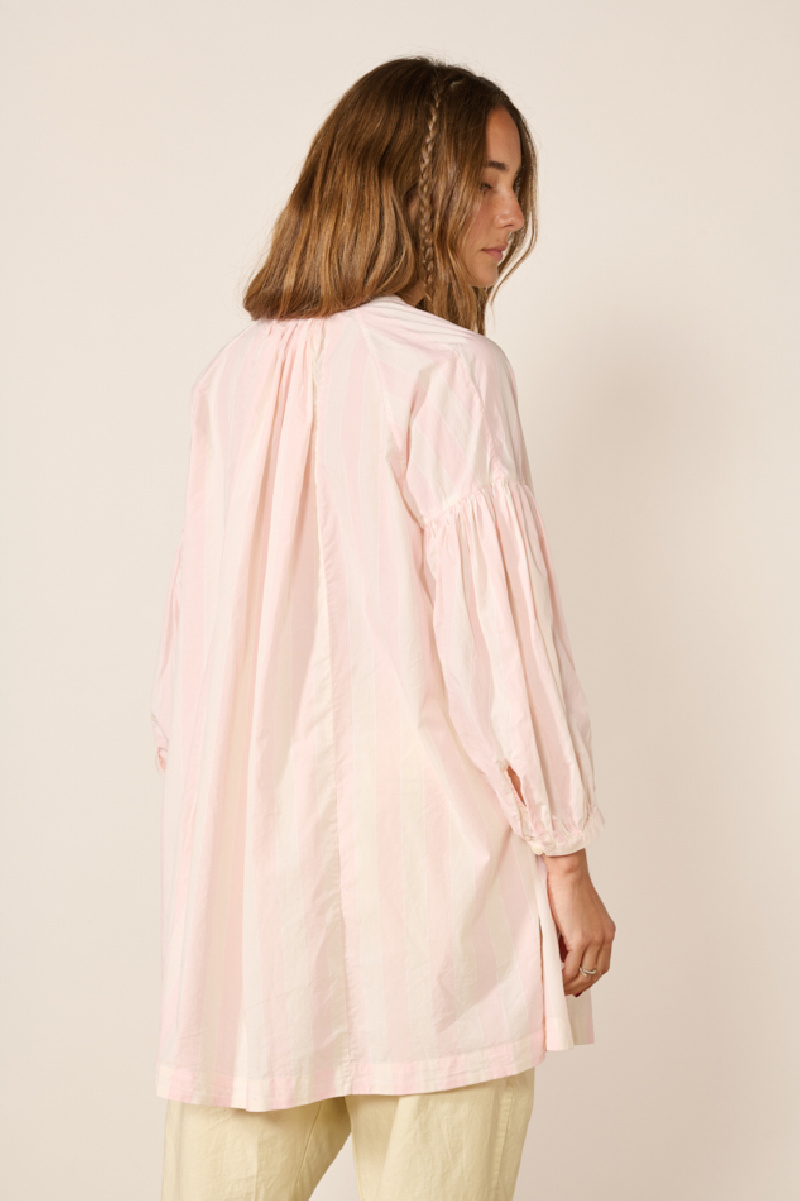 Son design à larges rayures roses et crème est sublimé par des détails froncés au niveau de l’encolure et des manches.