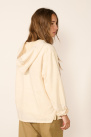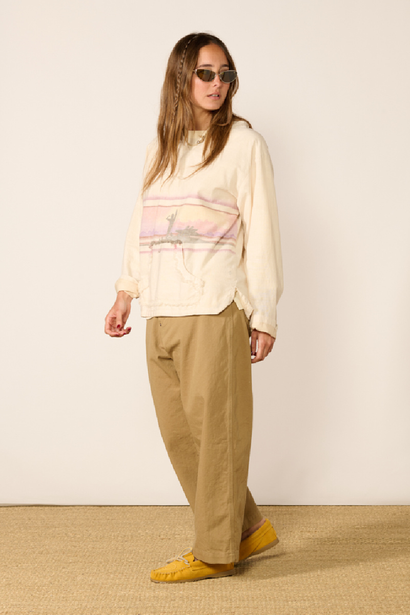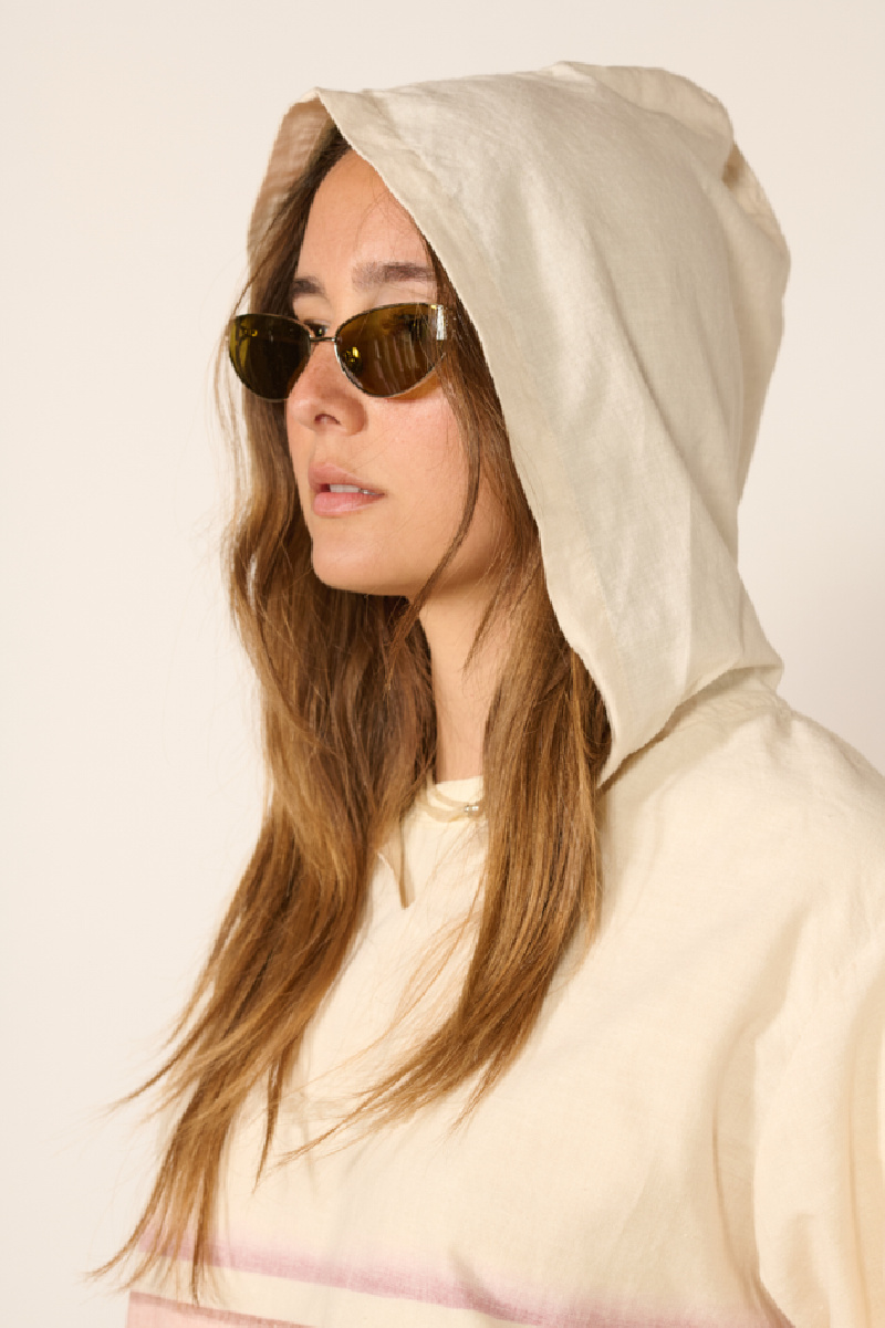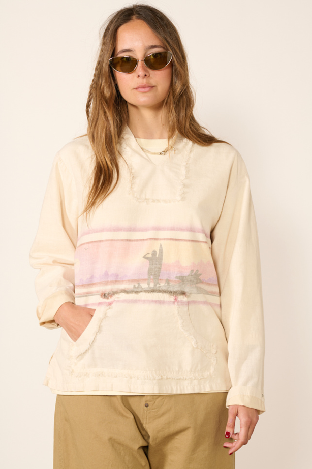 Elle offre une coupe droite fluide, agrémentée d’un motif évoquant un paysage panoramique aux tons pastels, d’une poche kangourou, d'une capuche et d’un empiècement au niveau du col avec finition effilochée.