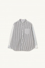 Elle présente une coupe droite et ample, avec un col boutonné, une fermeture frontale à boutons, un ourlet arrondi et une poche poitrine.