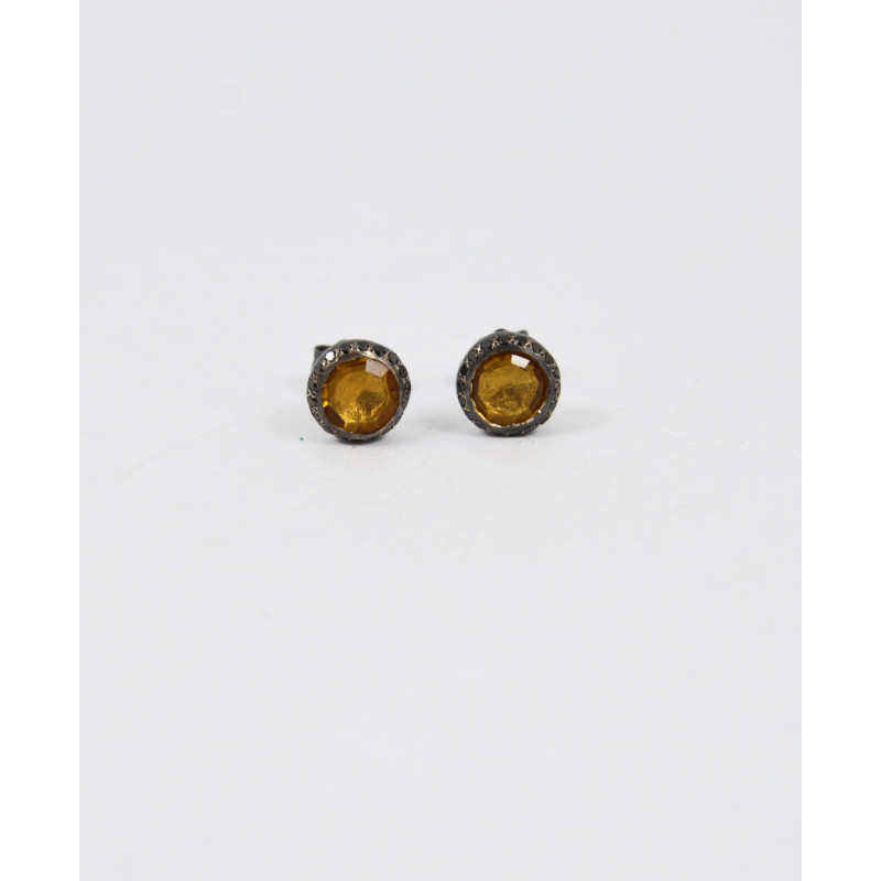 Boucles d'Oreilles Belquis Rosa Maria en argent serties de diamants noir et d'un crystal de quartz Cognac. Les bijoux de la marque Rosa Maria sont un mélange audacieux entre inspirations ethniques et esprit industriel brut.