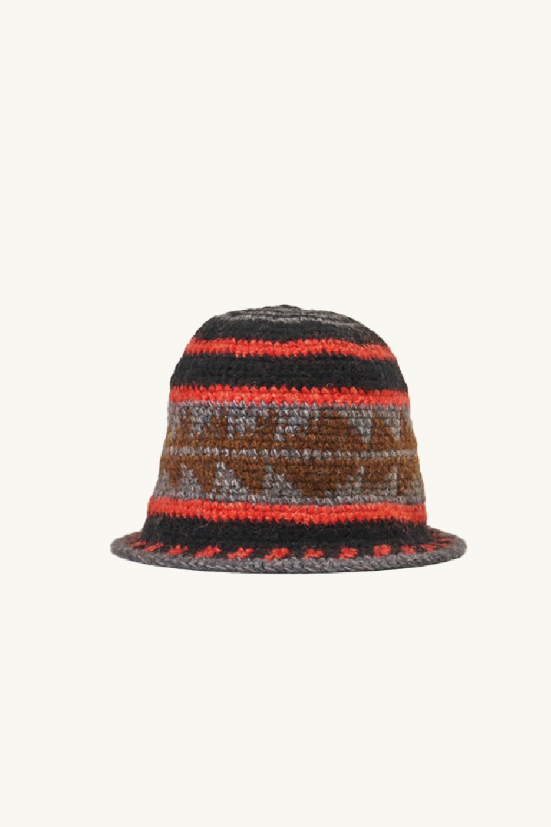 Confectionné dans un mélange de mohair et de laine, le chapeau Sublime est tricoté à la main au Népal. À la fois robuste et délicatement texturé, il associe des fibres de couleur grise, marron, rouge et noire.
