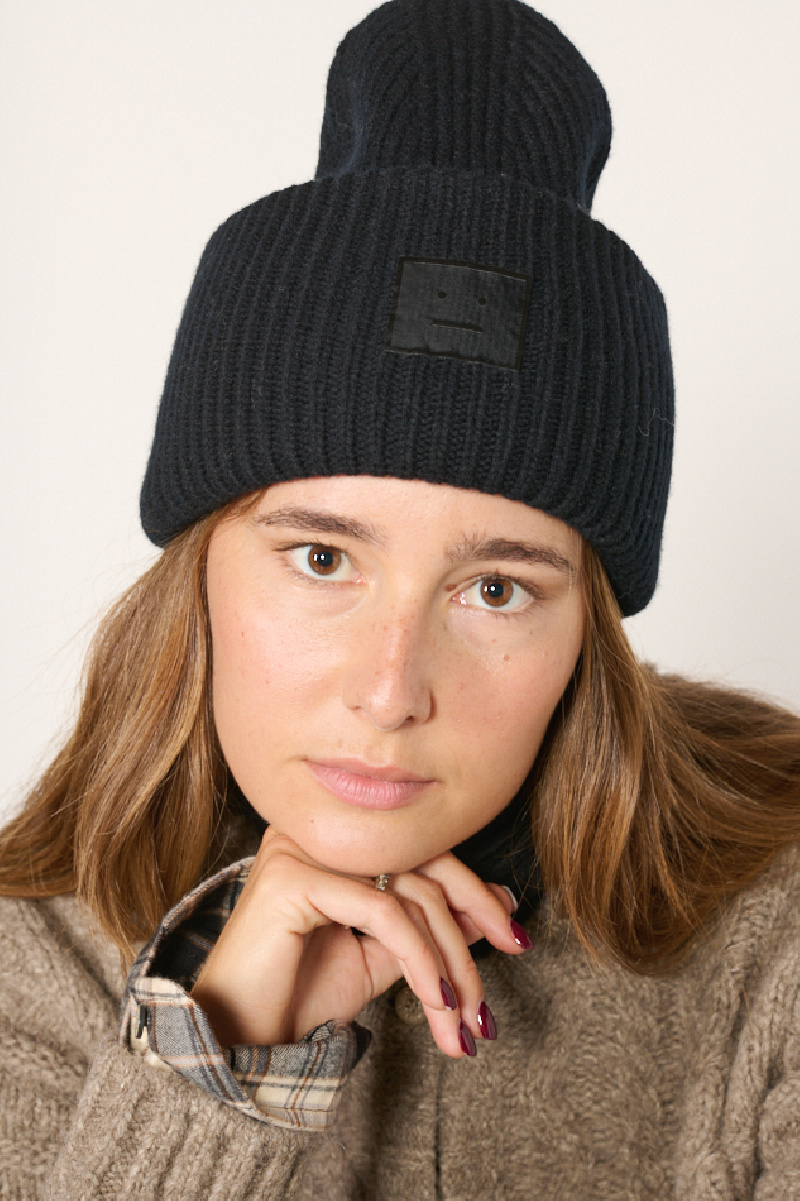 Il offre de larges bords retournés côtelés et est orné d’un large écusson ton sur ton.