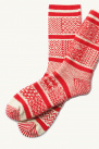 Chaussettes de la marque Rototo confectionnées en mélange de coton et de soie, rouge et ivoire, avec différents motifs jacquard.