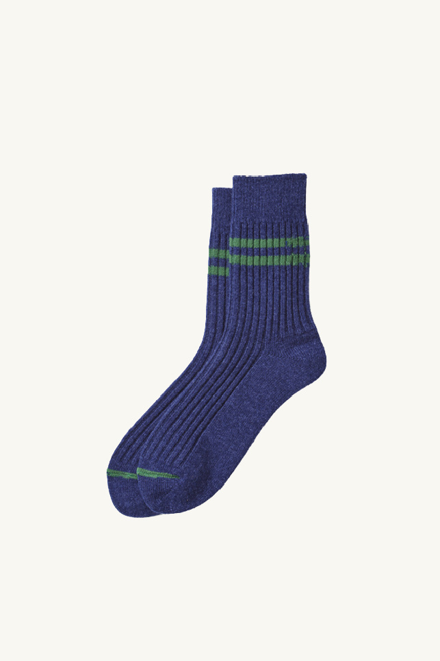Chaussettes Merino Rototo hautes en laine, chiné et côtelé en bleu marine et vert.