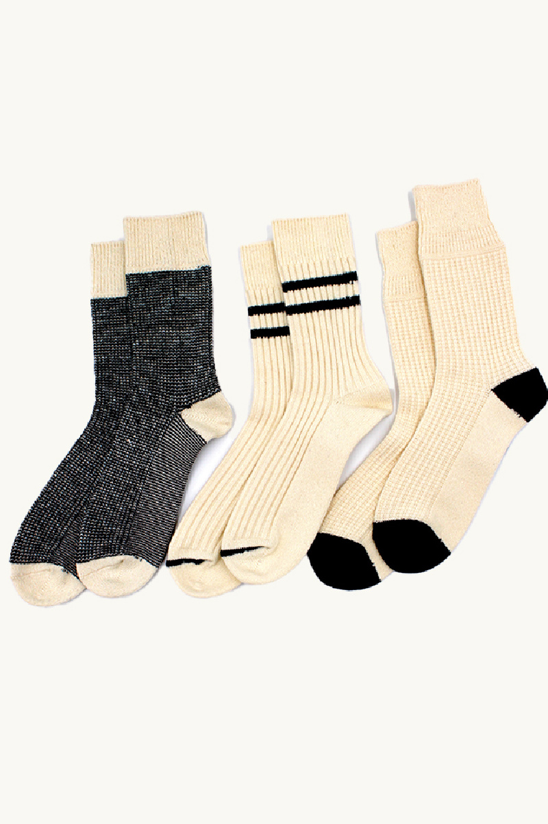 Lot de trois paires de chaussettes ROTOTO tricotées en laine. La première est beige avec un talon noir, la seconde beige arbore un liseré noir autour de la cheville, et la dernière est en chiné noir. Elles sont toutes très confortables.
