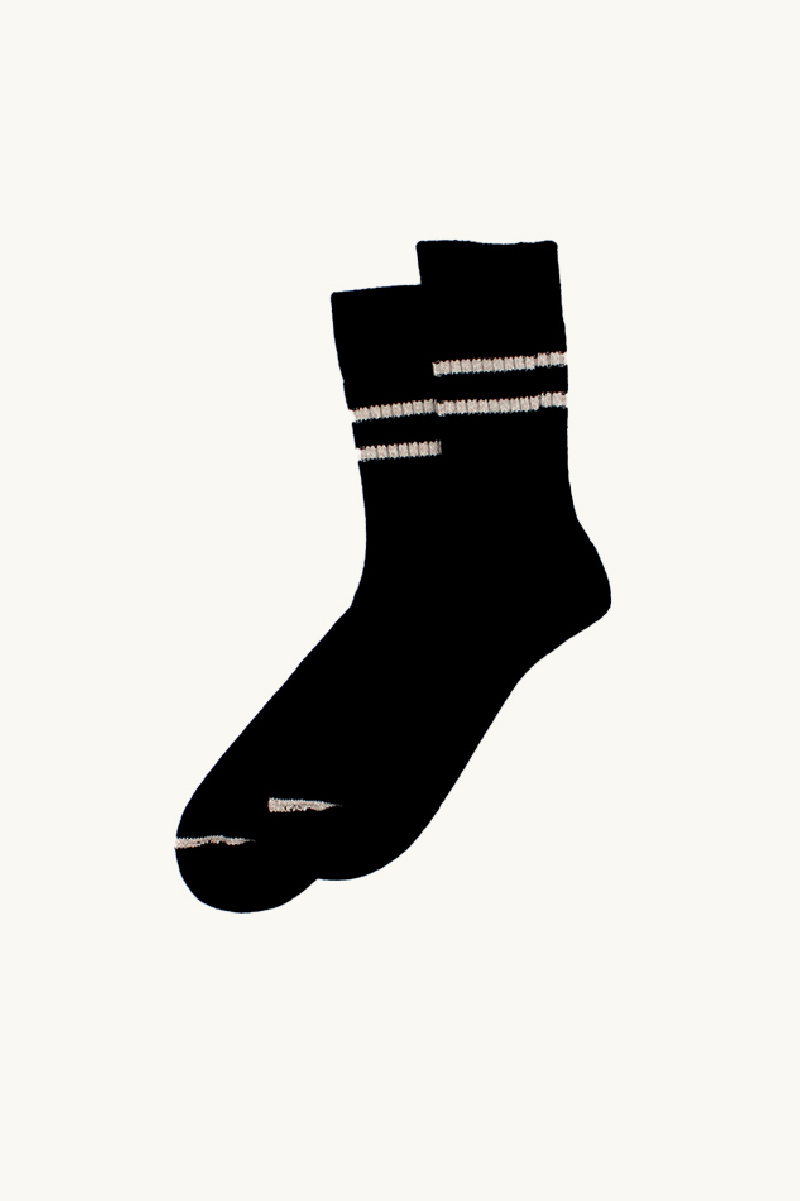 Lot de trois paires de chaussettes ROTOTO tricotées en laine. La première est noire avec un talon beige, la seconde noire arbore un liseré beige autour de la cheville, et la dernière est en chiné beige. Elles sont toutes très confortables.