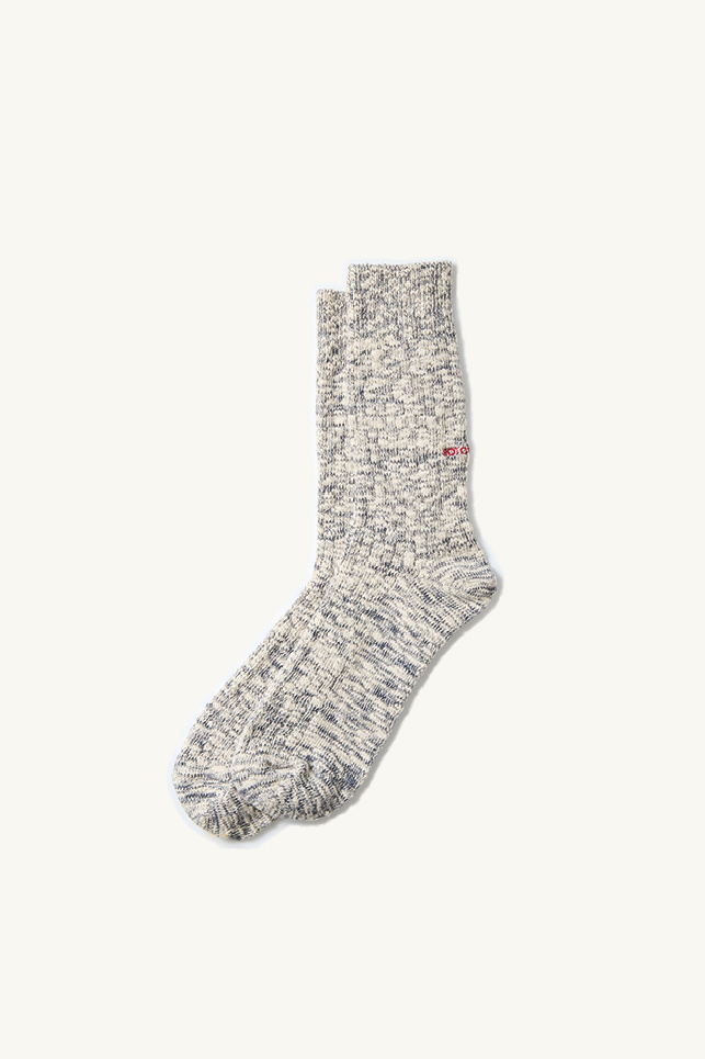Chaussettes confectionnées en maille flammée de coton beige et navy avec une fine broderie rouge - conçues pour un usage quotidien.