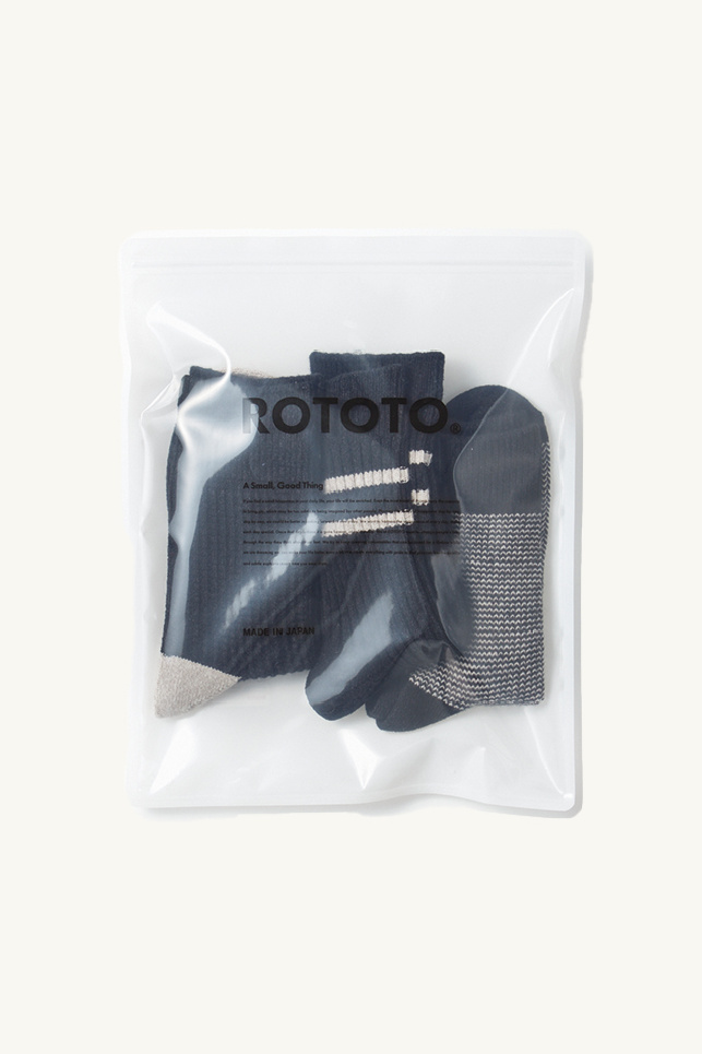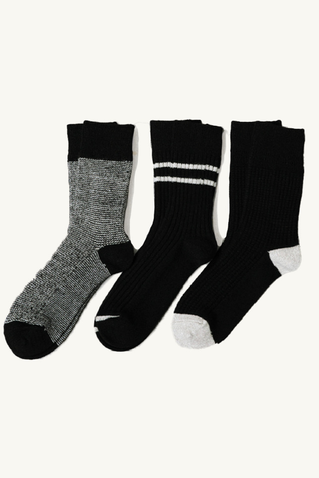 Lot de trois paires de chaussettes Rototo confectionnées en mélange de laine et de coton recyclés, déclinées dans les tons noir et gris.