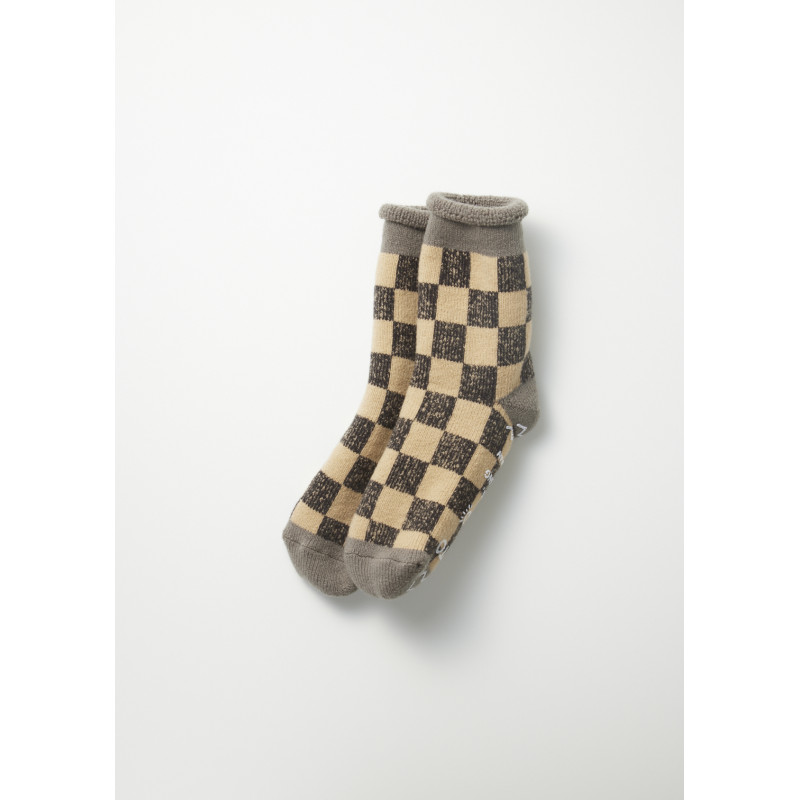 Chaussettes Pile Room ROTOTO cosy épaisses en lainage. Motif à damier noir et beige, détails gris sur le talon, au niveau des orteils, ainsi que sur le liseré en haut de la cheville. Revêtement anti-dérapant présent sous la voute plantaire.