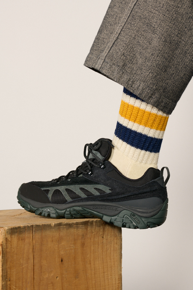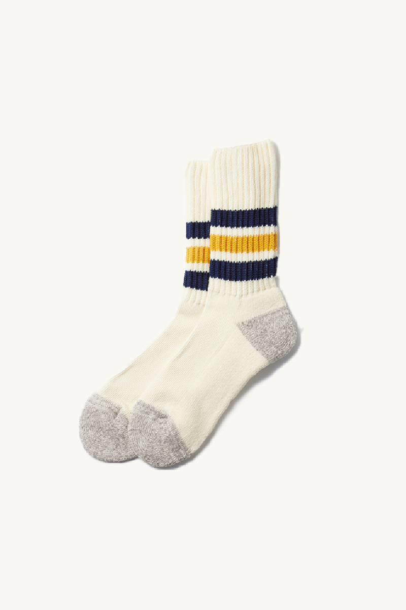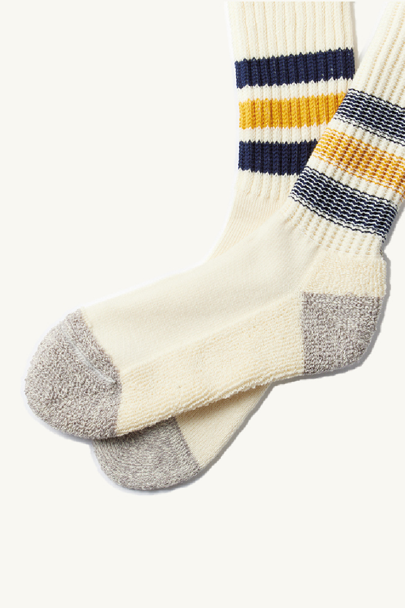 Chaussettes blanches en coton rayé Rototo, bandes et bouts des pieds contrastés, finitions côtelées, chaud et confortable, à enfiler.