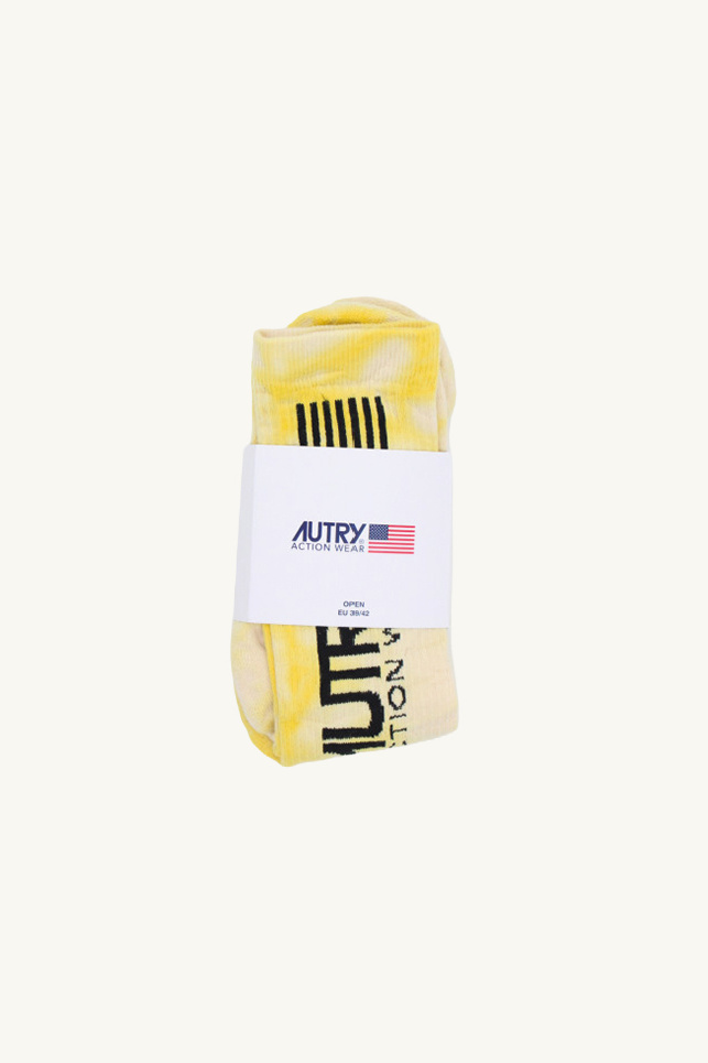 Chaussettes motif tie and dye jaune, montantes, mixtes, logo noir imprimé "Autry Action Wear", élastiques aux chevilles, bords côtelés.