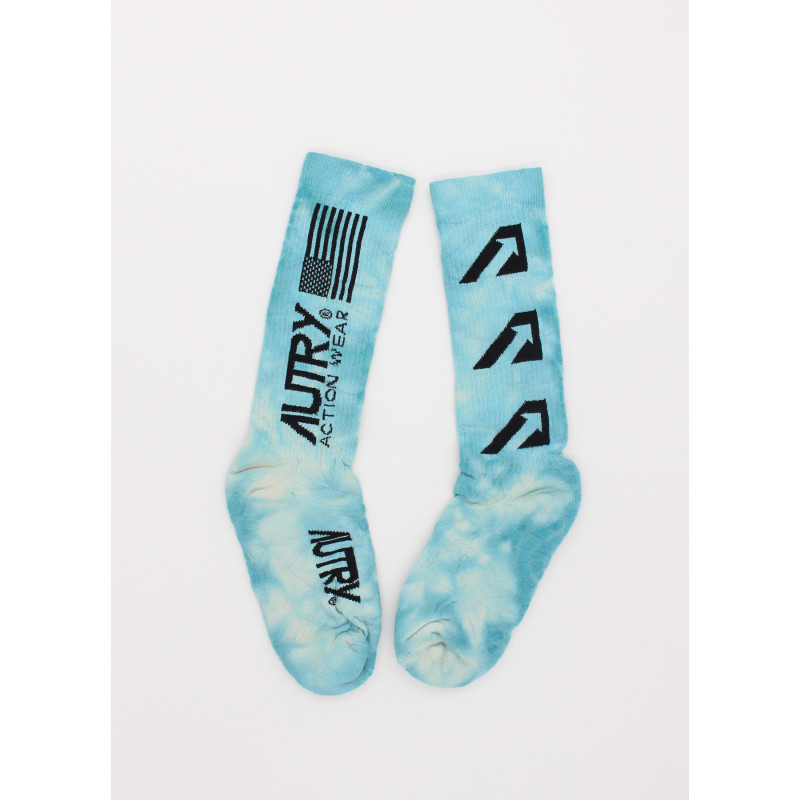 Chaussettes motif tie and dye bleu, montantes, mixtes, logo noir imprimé "Autry Action Wear", élastiques aux chevilles, bords côtelés.