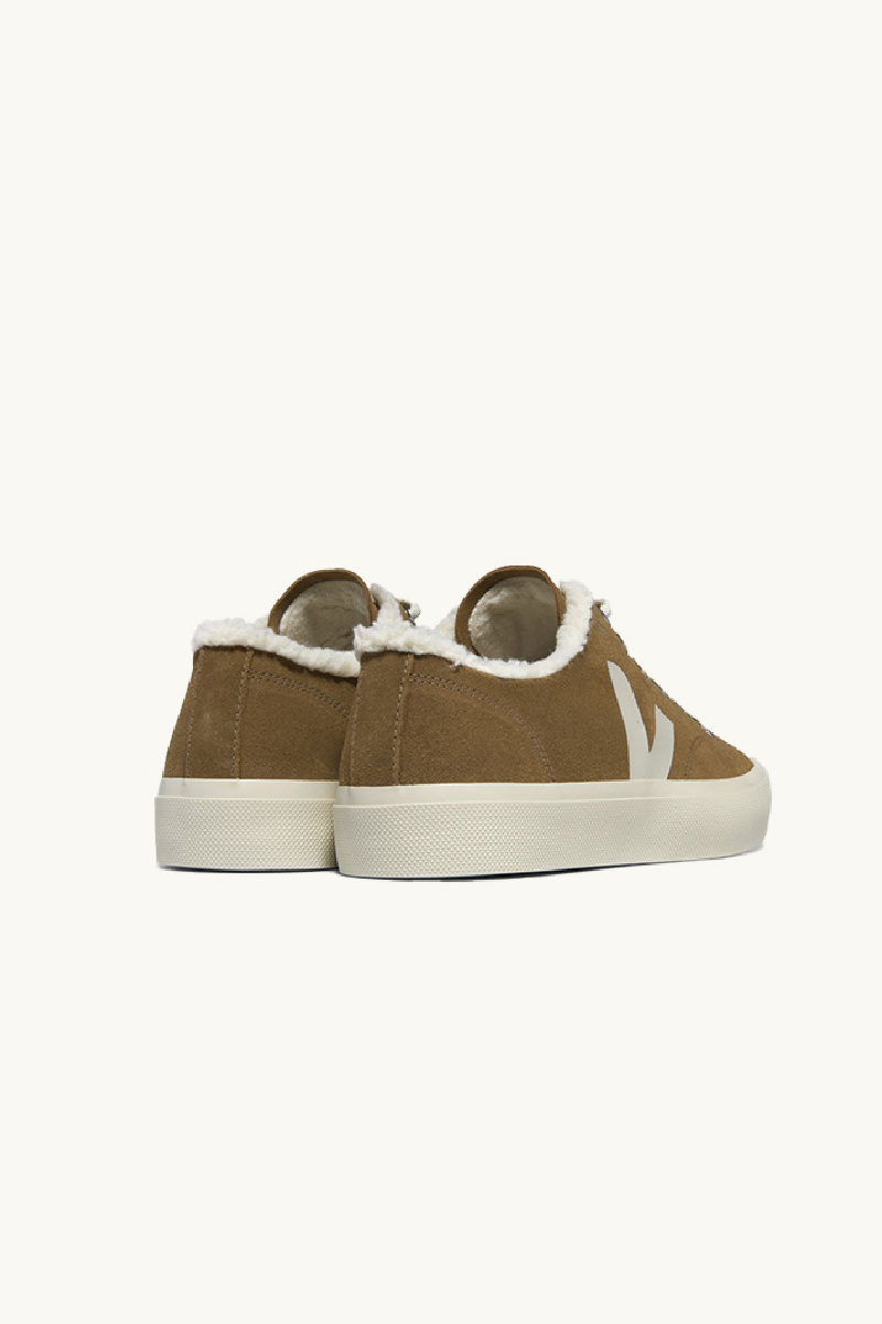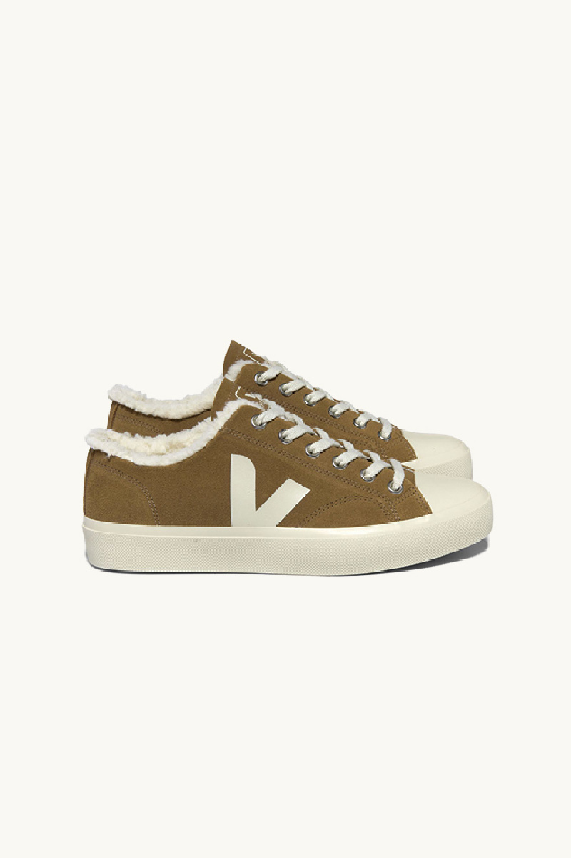 La paire de basket, basse avec une tige en Suède, couleur beige, logo en sérigraphie. Semelle intérieure en caoutchouc d'Amazonie, E.V.A. recyclé, molleton. Semelle extérieure en caoutchouc d'Amazonie, silice minérale. Doublure en molleton avec du polyester recyclé. Lacets en coton biologique.