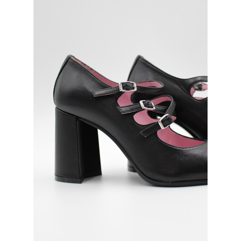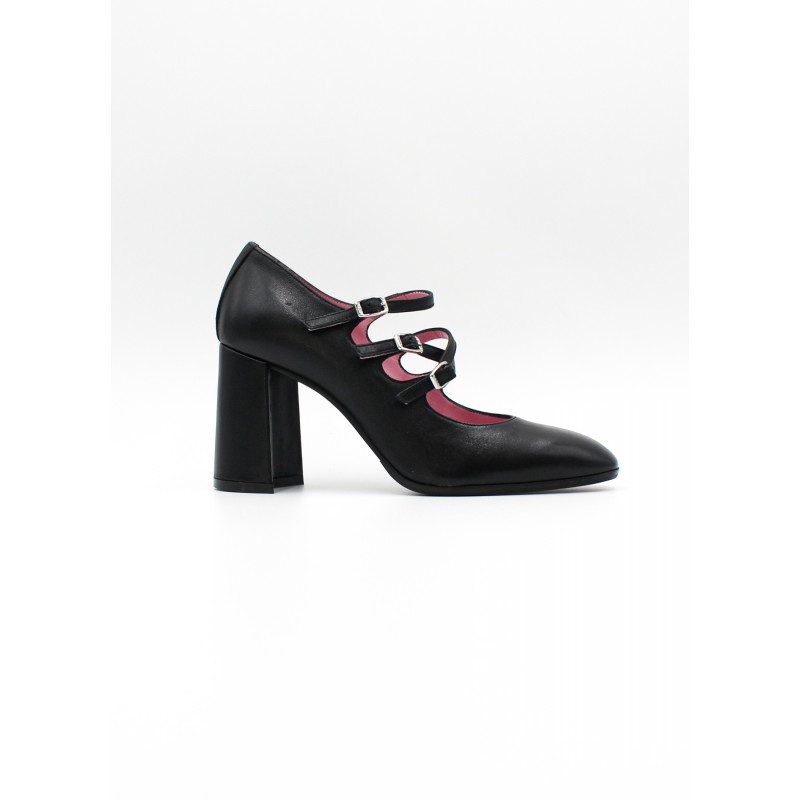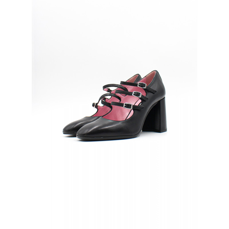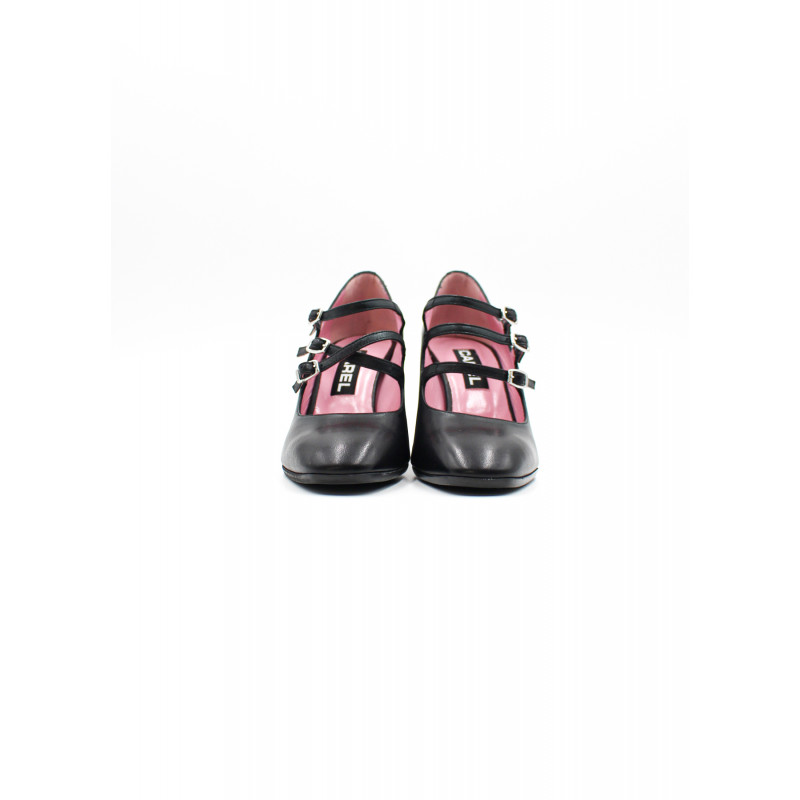 Modèle Keel Babies de la marque Carel, noir mate, talon de 8,5 cm, trois brides, intérieur rose, stylé rétro.