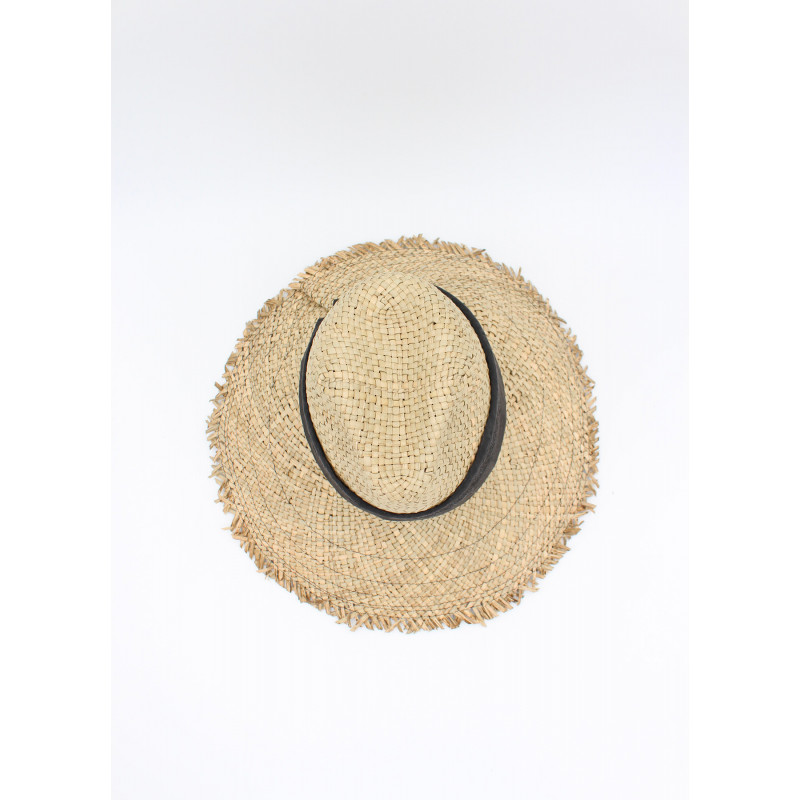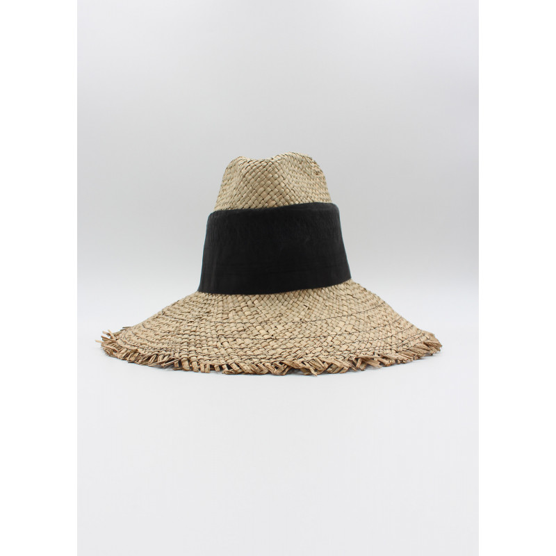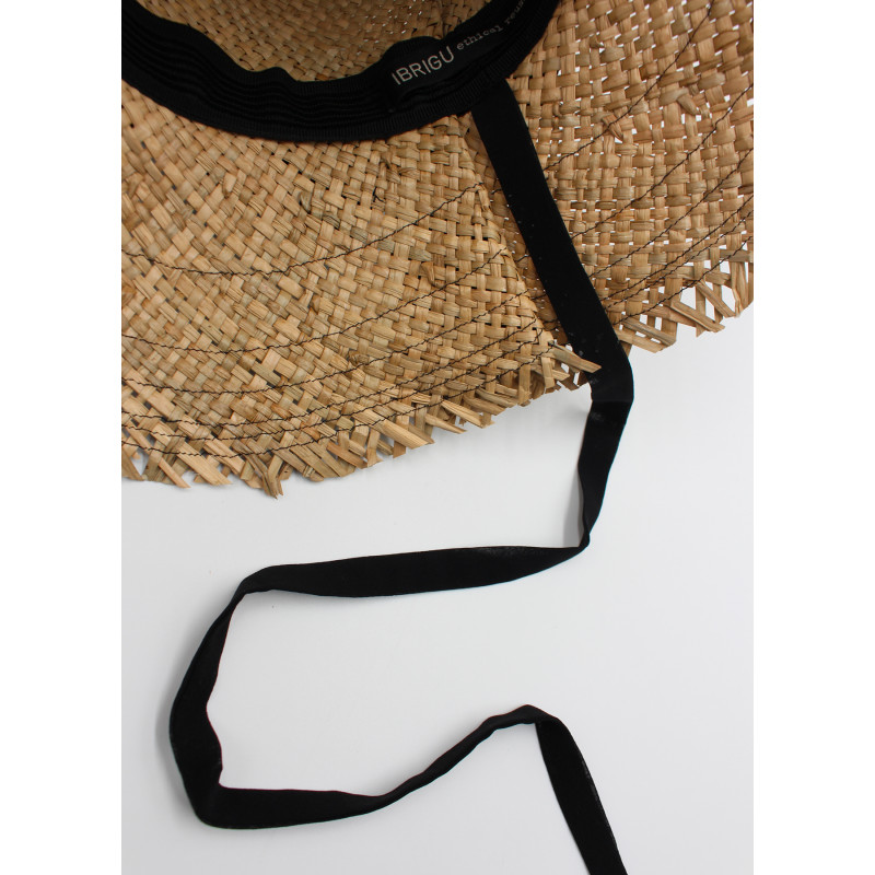Chapeau Ibrigu, paille tressée naturelle, tissu noir entourant le haut du chapeau.