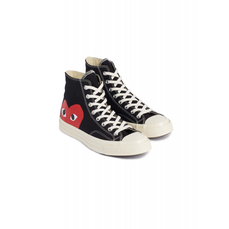Baskets Converse Chuck Taylor x CDG noires, motif coeur patch logo noir sur le côté, bout rond, fermeture à lacets, hauteur cheville, semelle en caoutchouc.