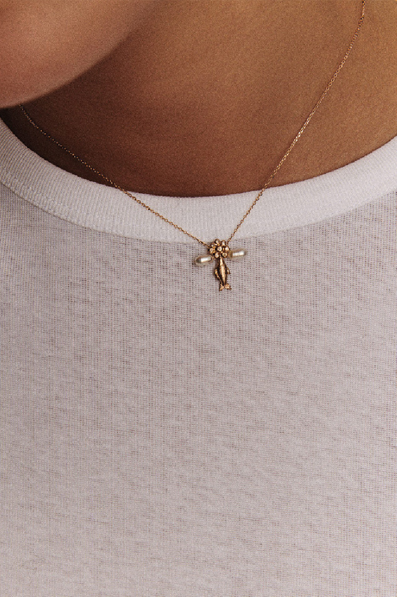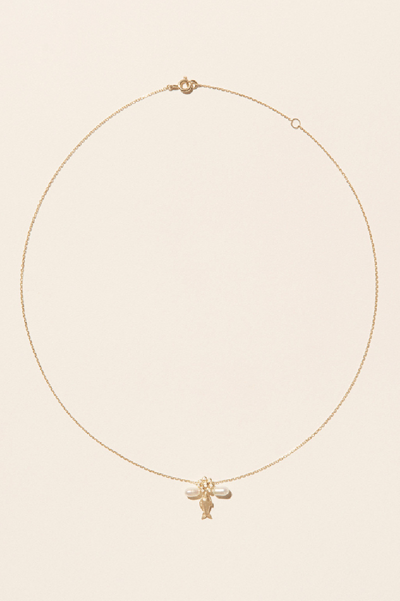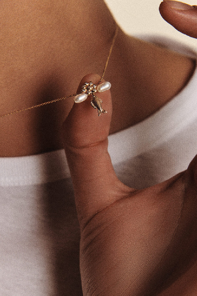 Le collier Daisy de la collection Palerme de Pascale Monvoisin est composé d'or, de diamants et de perles. Il présente une fine chaîne en or ras-du-cou, ornée d'un petit poisson accroché à une fleur de perles d'eau douce et de diamants.