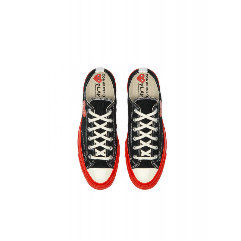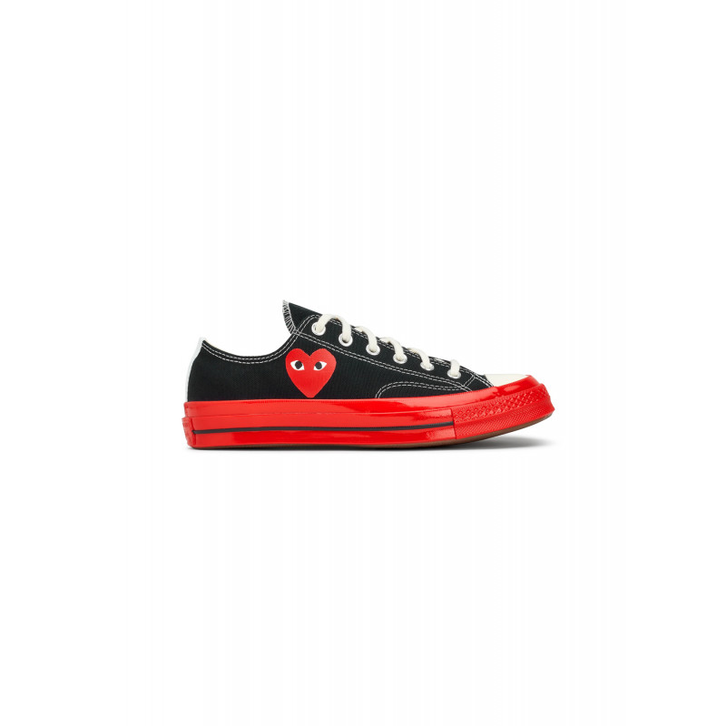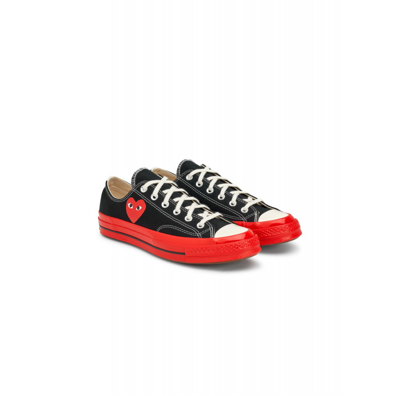Converse Chuck Taylor x CDG basses noires, motif coeur patch logo rouge sur le côté, bout rond, fermeture à lacets, semelle en caoutchouc rouge.