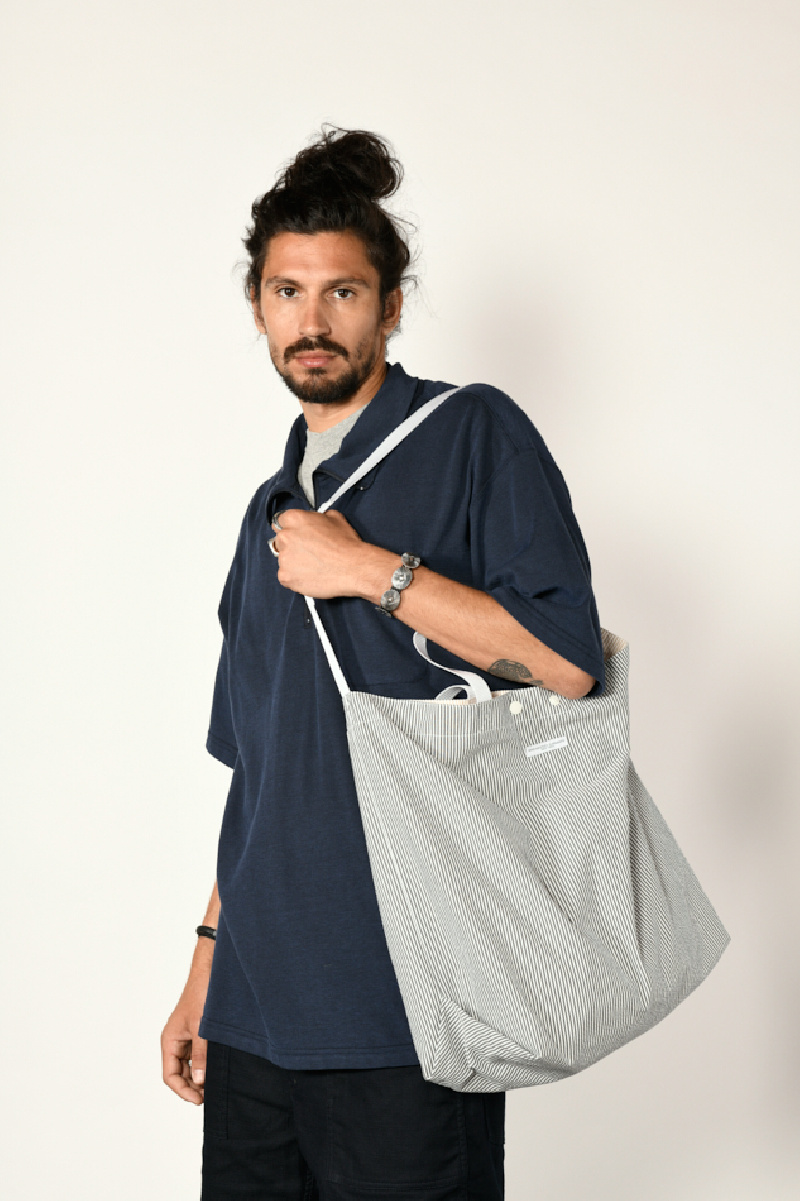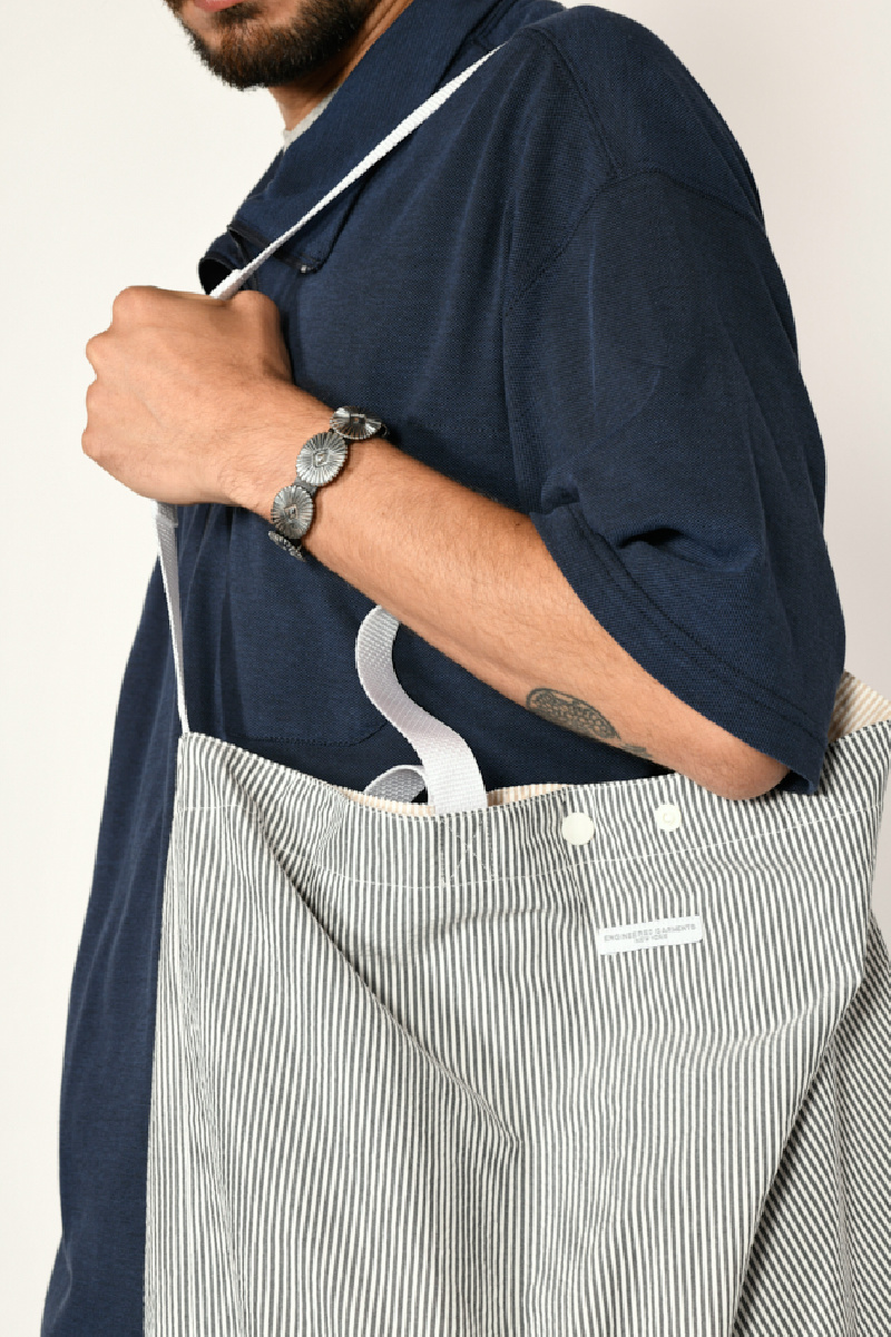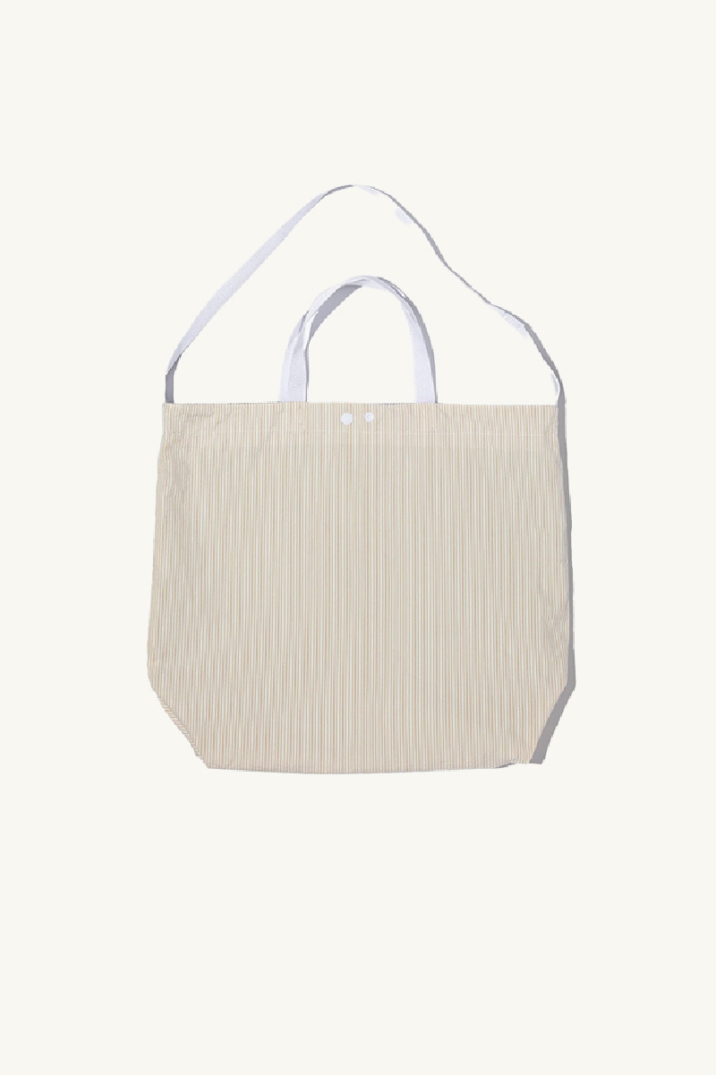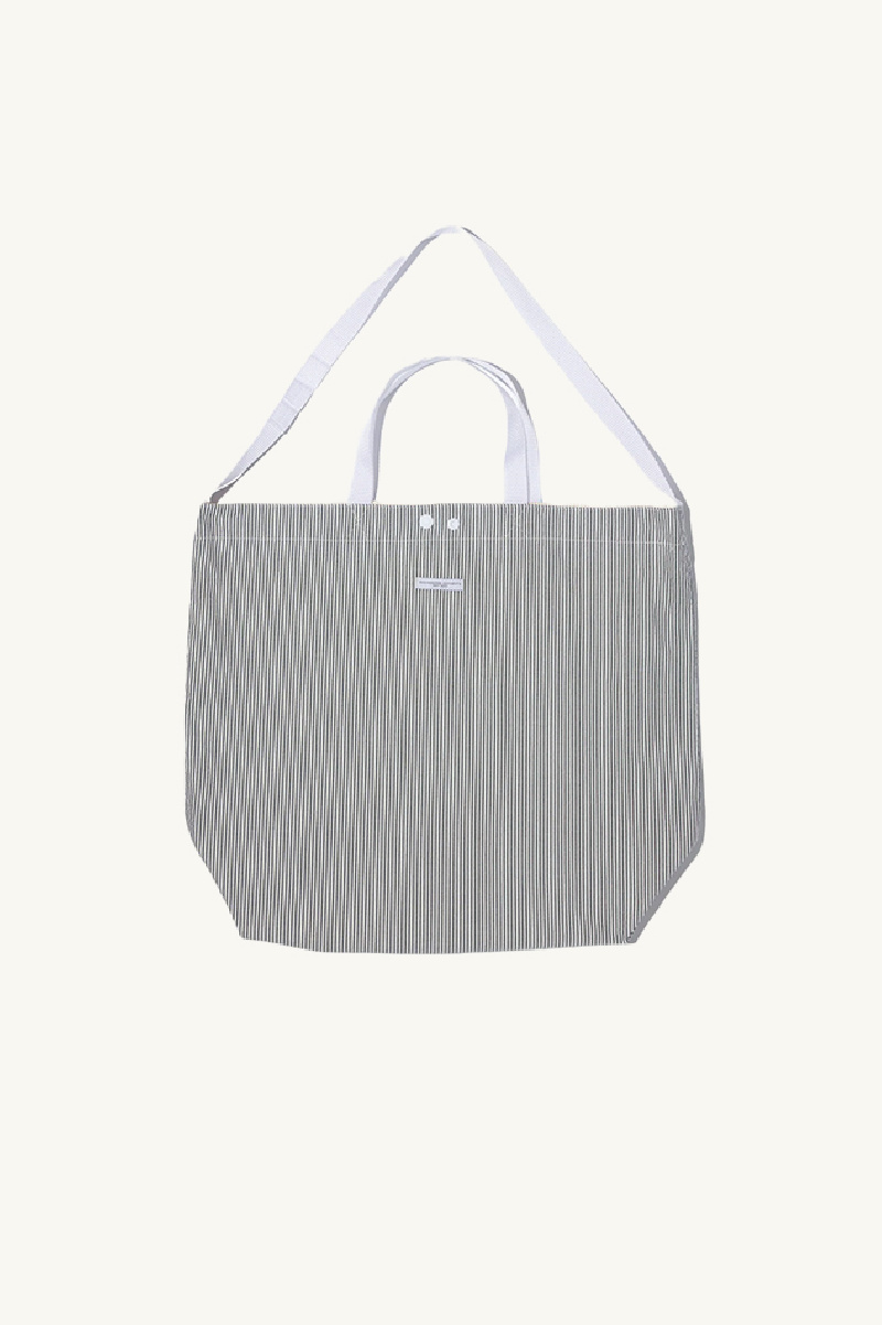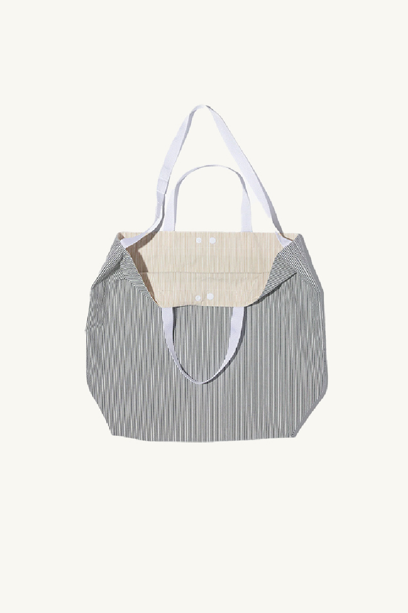 Tote bag reversible confectionné en coton à rayures bleu marine et beige, de la marque Engineered Garments.