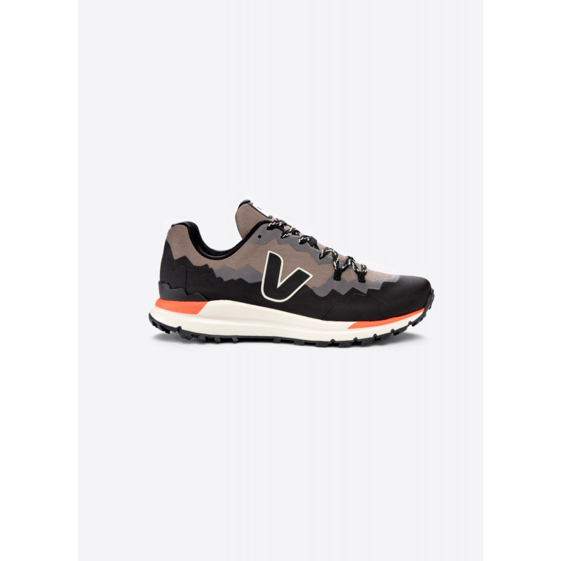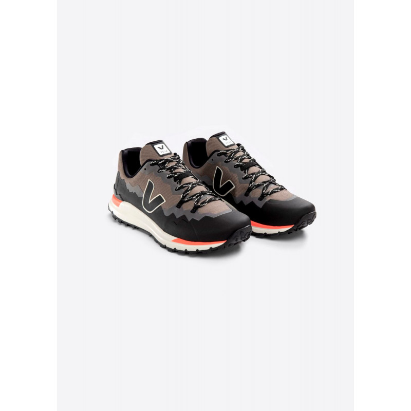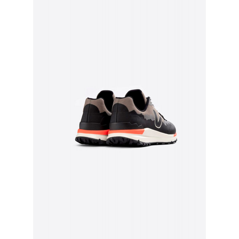 Basket Veja modèle Fitz Roy noir designé pour les treks et randonnées, chaussure technique, semelle solide et stable, crampons multidirectionnels, logo V bleu marine, empiècements rappelant les montagnes tons sur ton, lacets plats, semelles en caoutchouc avec détails rouges.