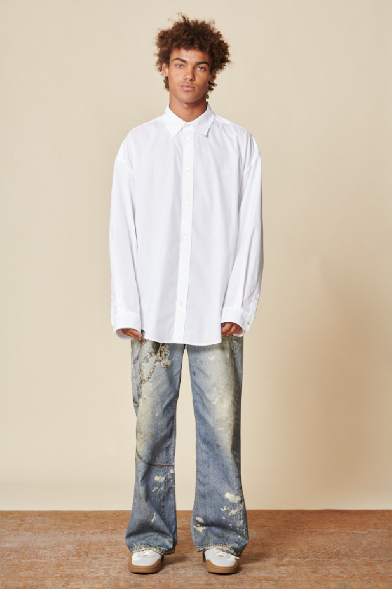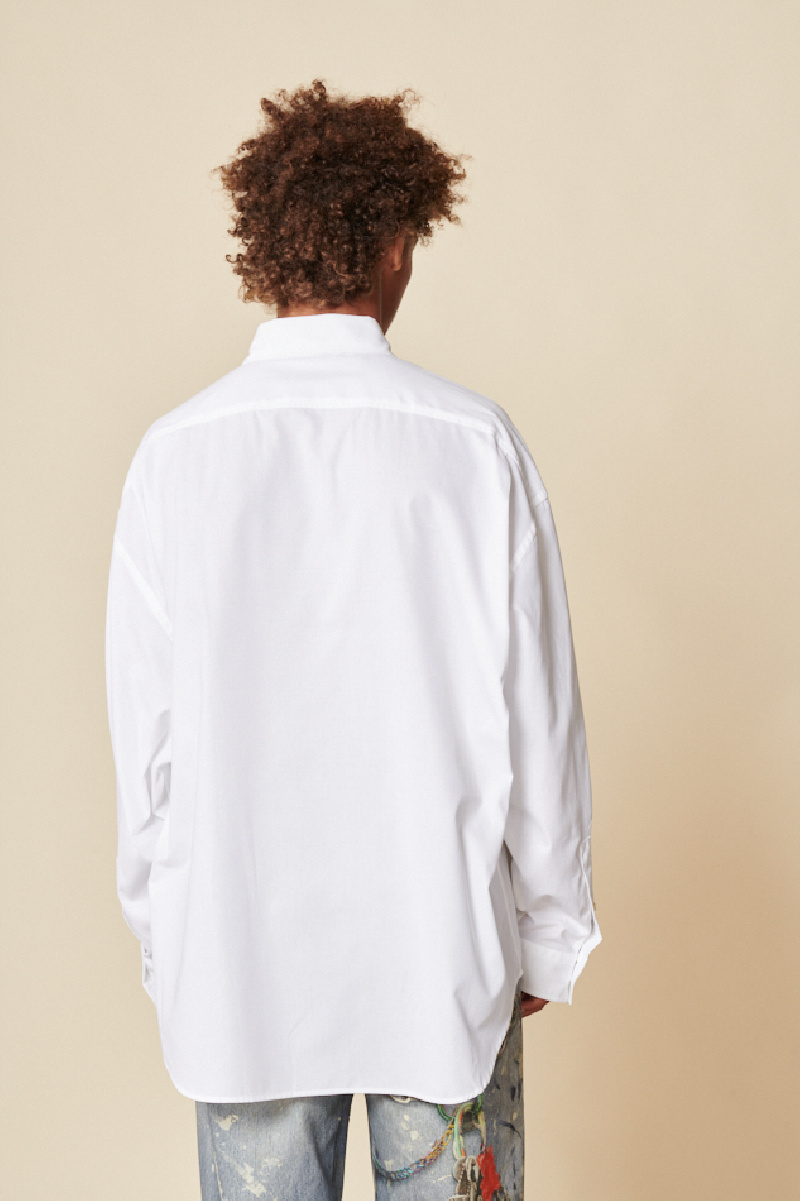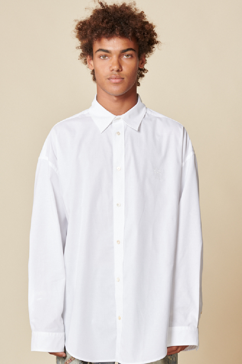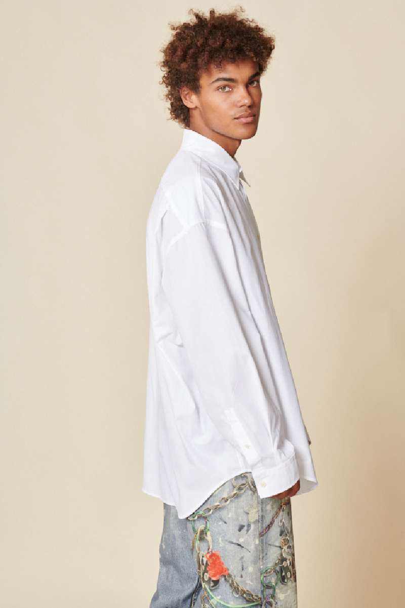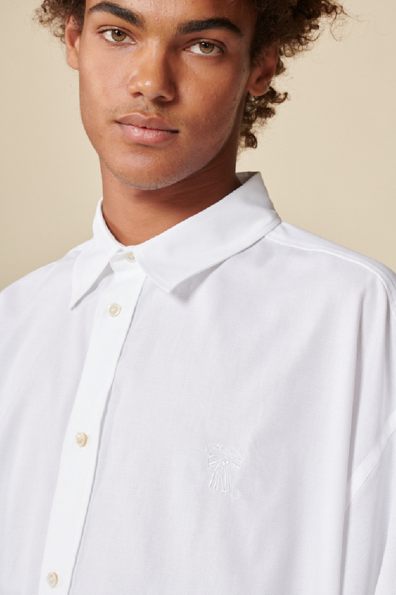 La chemise en coton, de la marque Acne Studios, blanc, avec coupe droite et oversize, longueur aux hanches, fermeture par boutons blancs, manches longues, avec boutons de chaque côtés des poignets, et un logo floqué sur le côté gauche au niveau de la poitrine.
