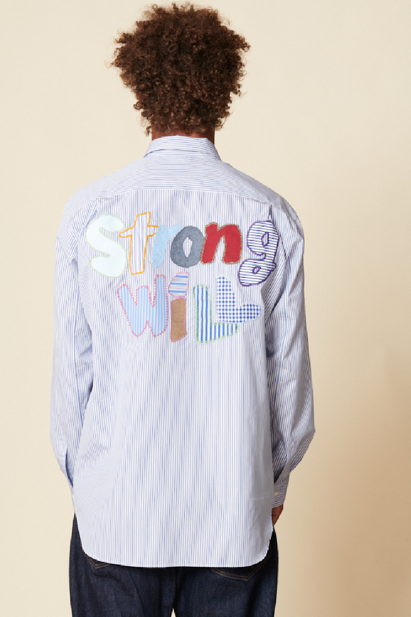 La chemise Comme des Garçons Shirt présente une coupe droite avec des manches et corps rayés en navy et bleu clair, une poche plaquée sur la poitrine, un imprimé à rayures épaisses, et arbore au dos une inscription multicolore "Strong Will"