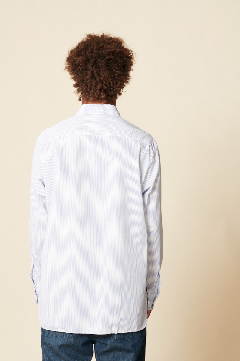 La chemise blanche rayée, de la marque Sage de Cret, offre une coupe droite avec des manches longues et un corps à rayures bleu roi, agrémentée d'une poche plaquée sur la poitrine et d'un imprimé à rayures fines pour un look à la fois élégant et décontracté.