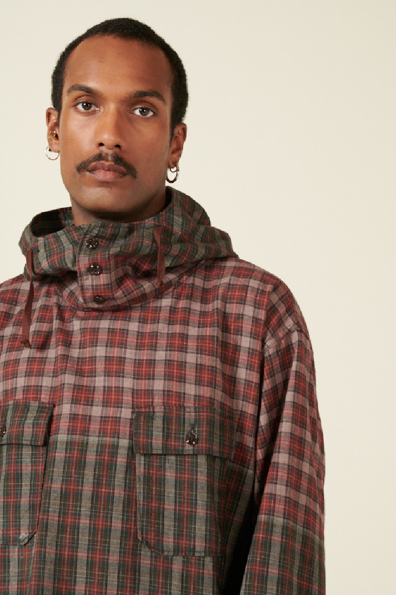 La chemise à capuche à carreaux noir et rouge de la marque Engineered Garments, inspirée d'un sweat, se caractérise par une coupe droite et ample, des manches longues avec des boutons aux extrémités, et une fermeture à quatre boutons au bas du col. Elle est également dotée de deux poches plaquées sur le devant au niveau de la poitrine, de deux autres de chaque côté, ainsi que d'un cordon de serrage à la taille.