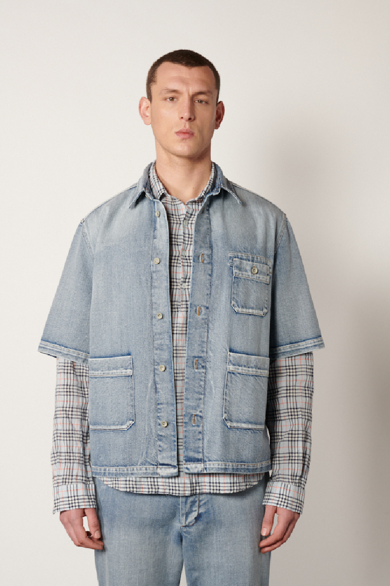 Son design se distingue par des lignes nettes et une coupe carrée, agrémentée de manches courtes, de deux poches plaquées et une au niveau de la poitrine.