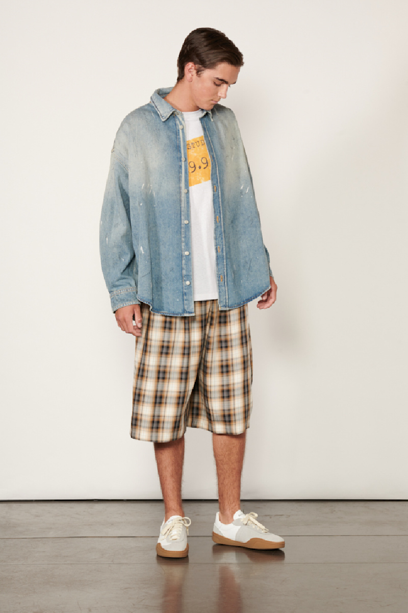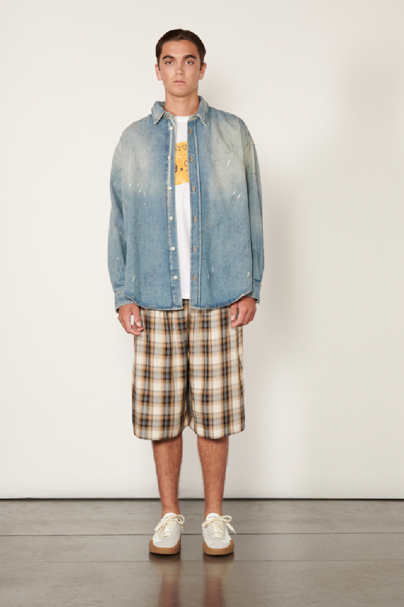 Elle offre une coupe unisexe décontractée avec une fermeture par boutons jean, des épaules descendues, un ourlet arrondi asymétrique, des surpiqures couleur maïs, et une étiquette avec logo au dos.