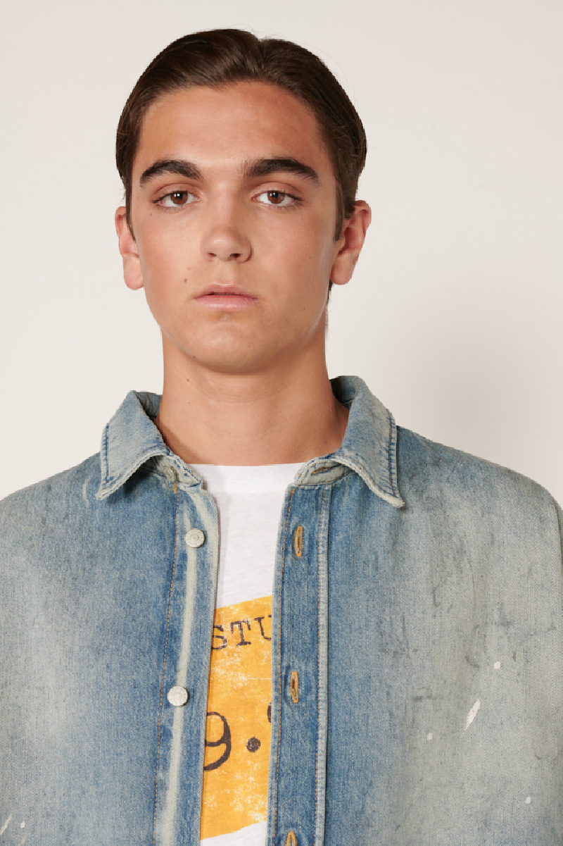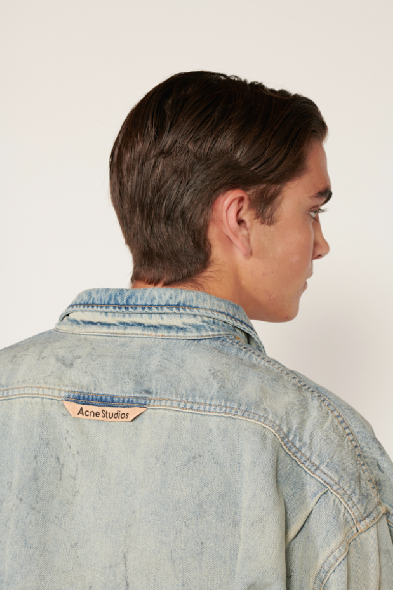 Chemise denim avec un délavage bleu clair avec un effet vieilli et taché, de la marque Acne Studios.