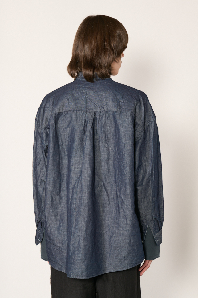 Chemise indigo confectionnée en denim de lin lavé, lui donnant un léger aspect brillant et texturé, de la marque Casey Casey.