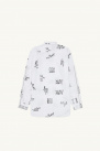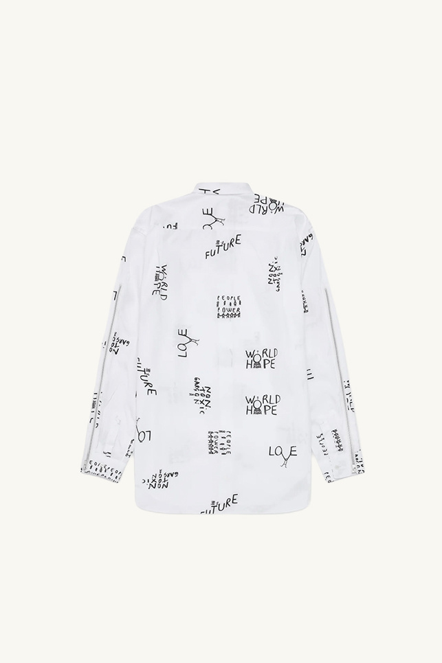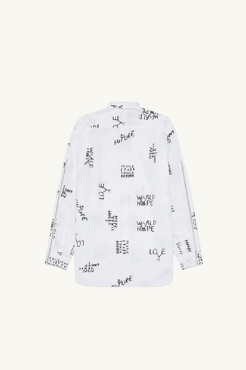 Chemise à imprimés graphiques noirs confectionnée en popeline de coton blanche, de la marque Comme des Garçons Shirt.