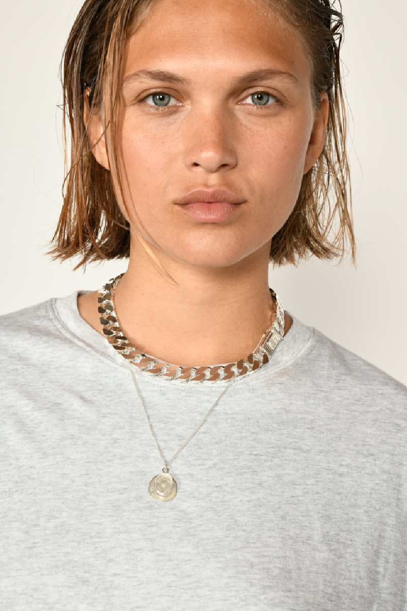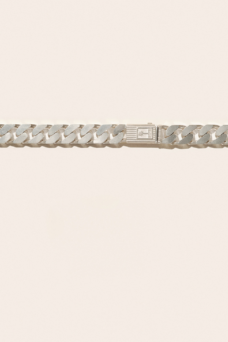 Ce collier insuffle une âme nouvelle à l’iconique gourmette en argent. Ce long collier (74 cm, ajustable à 70 cm) se distingue par un pendentif sculptural (3,1 x 2,3 x 1,2 cm), inspiré des briquets vintage des années 70, et fermé par un fermoir godronné orné de l’emblème de la maison.