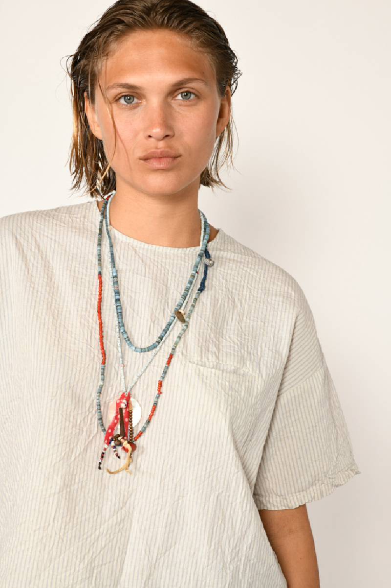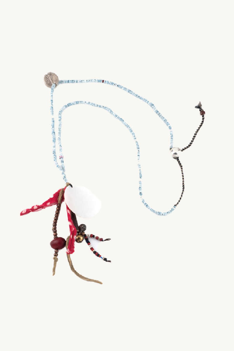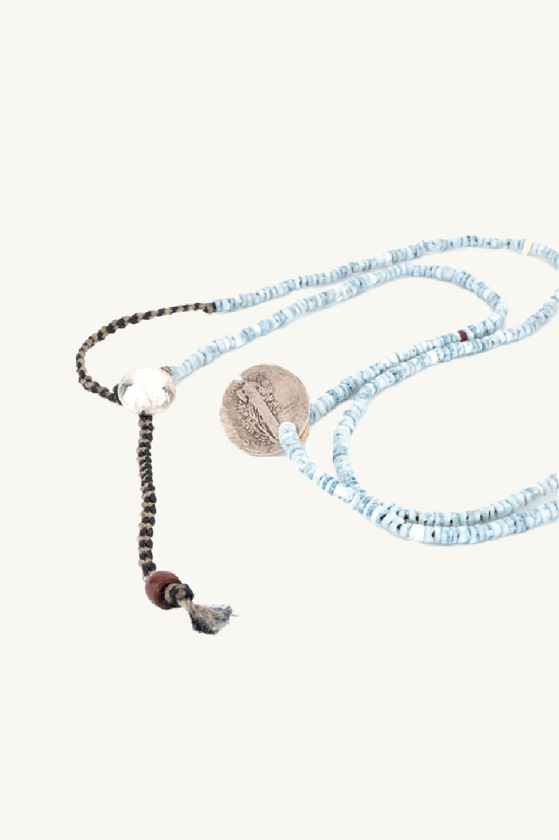 Long collier de style sautoir, de la marque Northworks, en perles et coquillages teint en indigo avec des breloques.