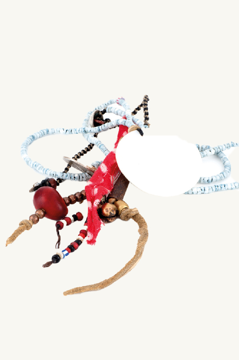 Perle, tissu, pièce de cuivre, coquillage, cuir