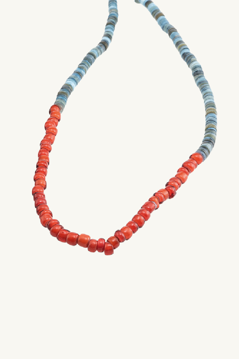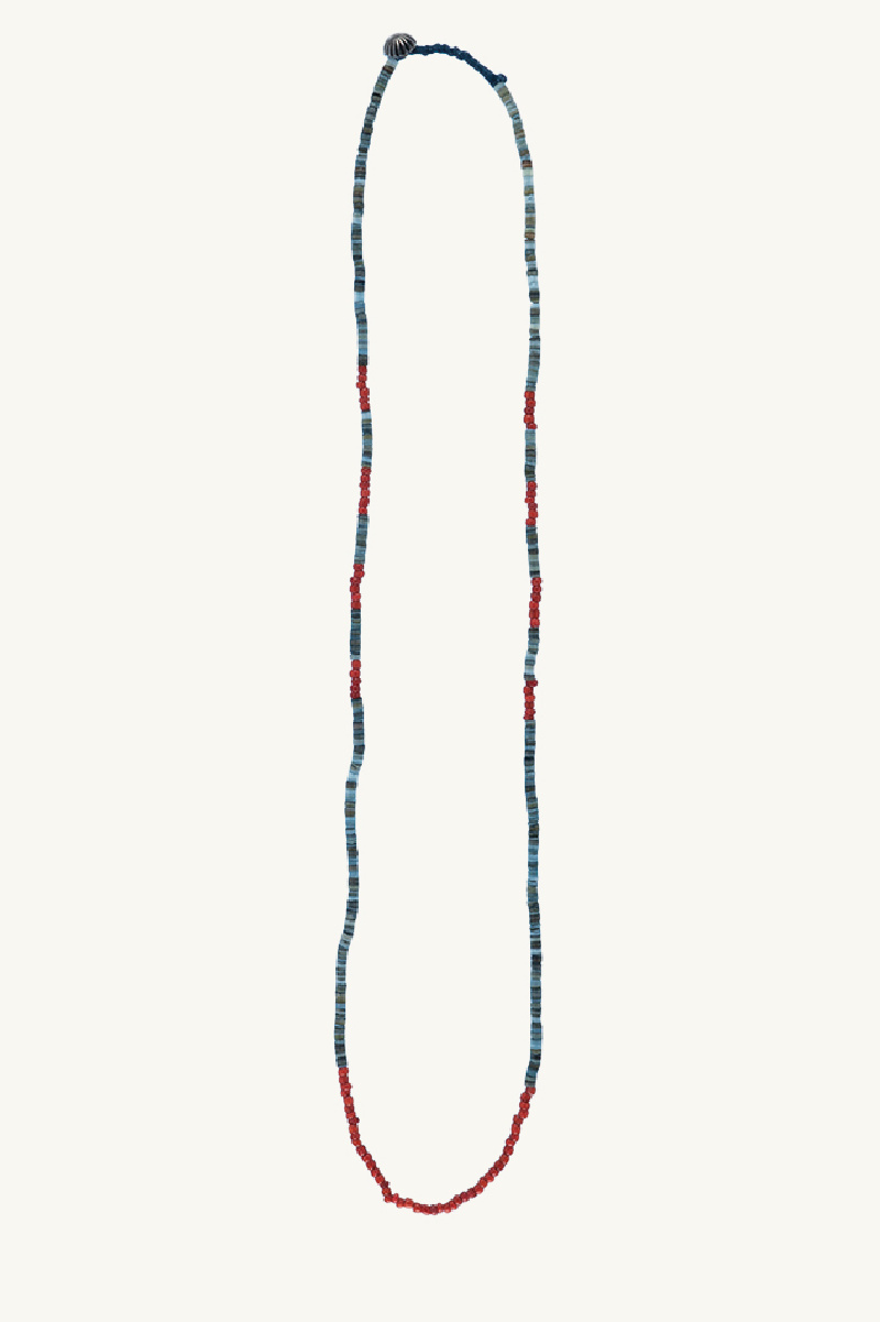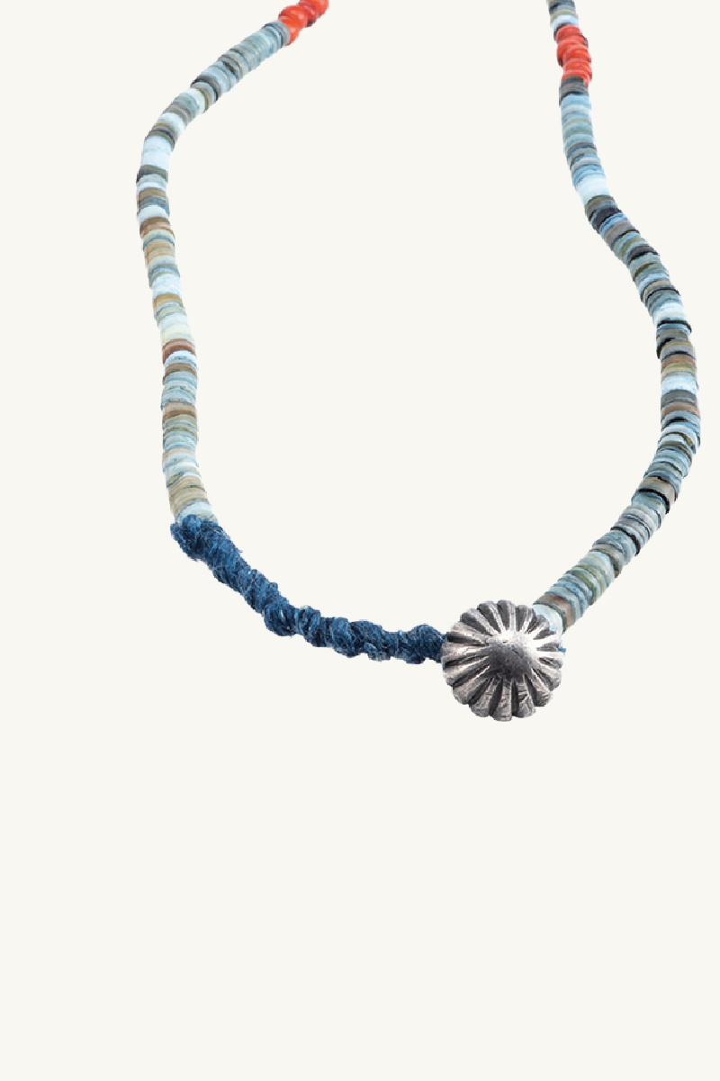 Long collier de style sautoir, de la marque North Works, en coquillages teint en indigo et perles rouge et avec un coquillage en laiton argenté gravé.