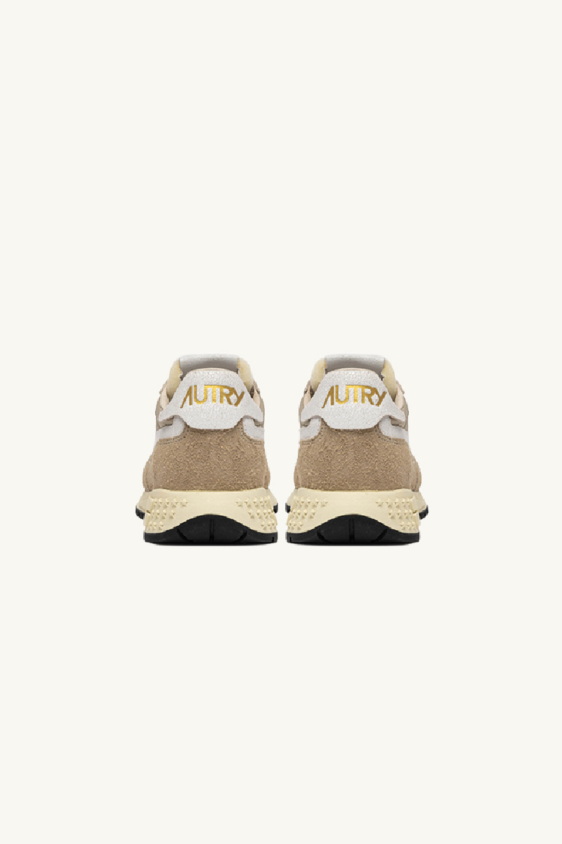 Baskets Reelwind Low de la marque Autry, beige foncé, en daim élégant et nylon durable. Semelle extérieure en caoutchouc et phylon ultra-léger. Offre confort et légèreté. Détails sur la semelle. Étiquette en cuir brodé sur la languette.