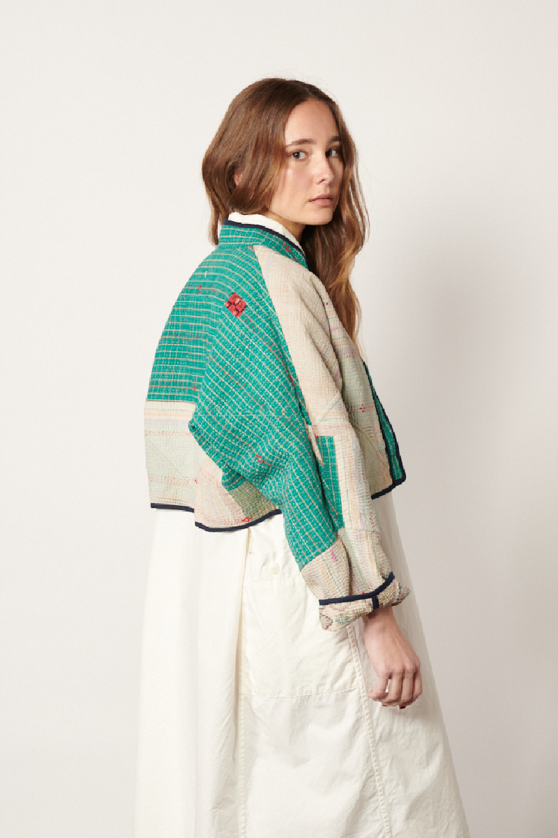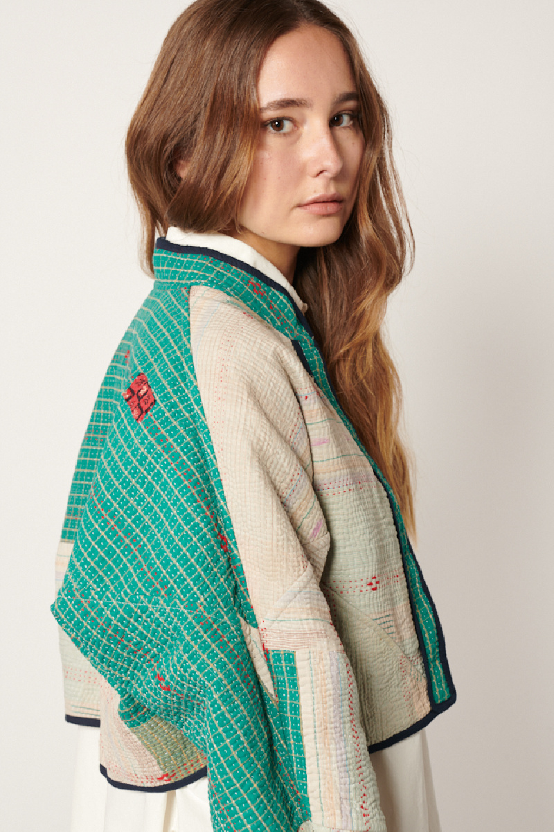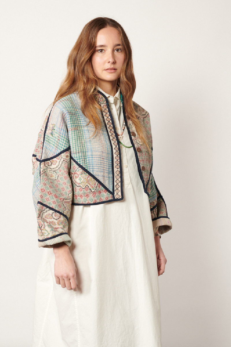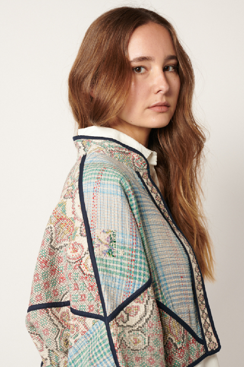 Veste Réversible courte en patchworks multicolores floraux et géométriques, de la marque Namai Studio.