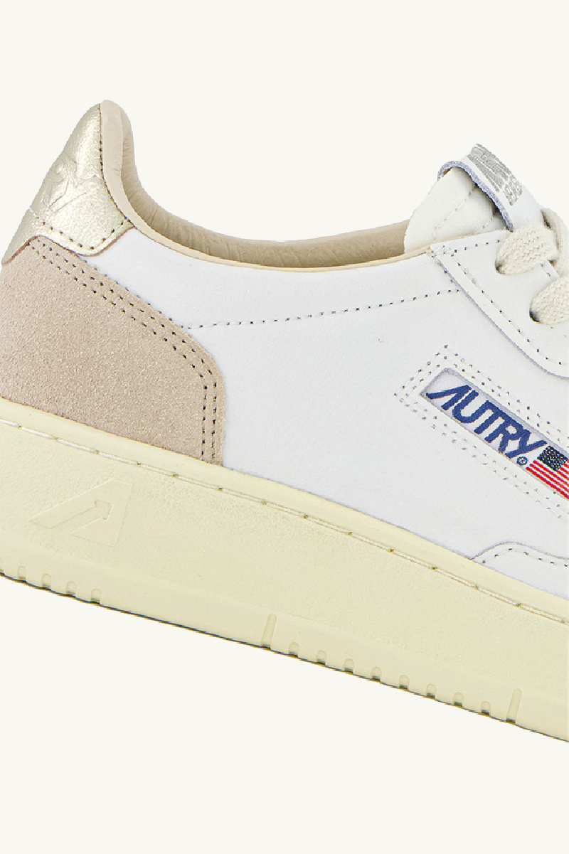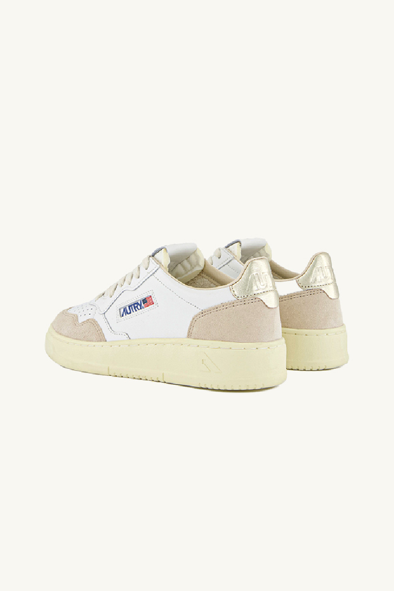 Paire de baskets AUTRY, Medalist low, blanche, en croute de cuir. Renforts en daim beige, avant-pied perforé, semelle en caoutchouc, fermeture à lacets plats en coton blanc cassé, languette en tissu avec étiquette, détail arrière en cuir couleur or.
