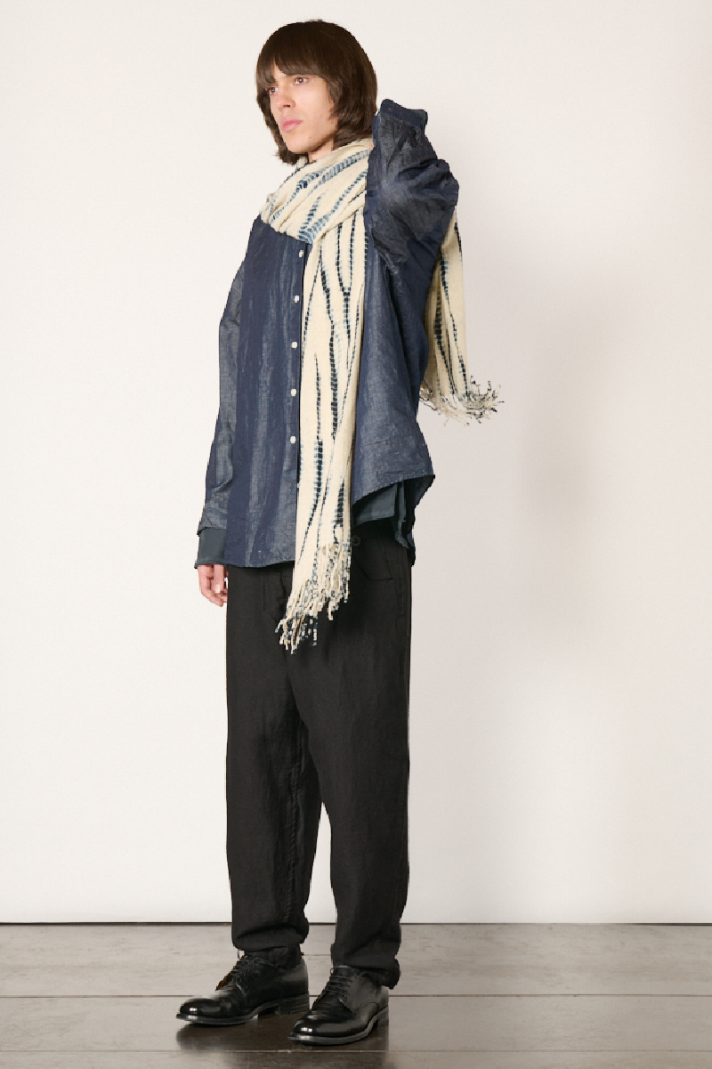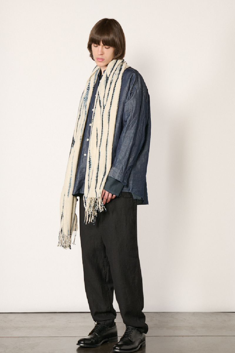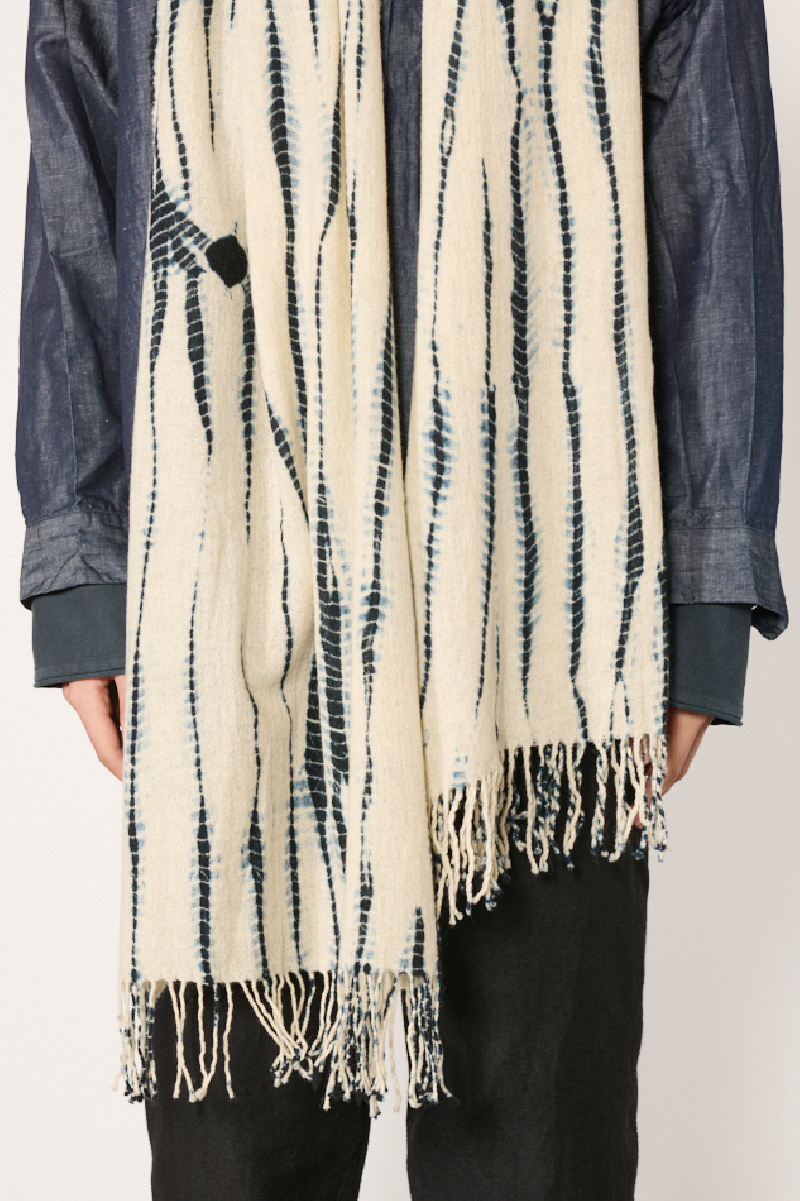 Étole en laine et cachemire de couleur écrue avec un imprimé shibori bleu marine de la marque Suzusan. De grand format, elle est ornée de franges aux extrémités. Le shibori désigne une technique de teinture japonaise ancestrale.