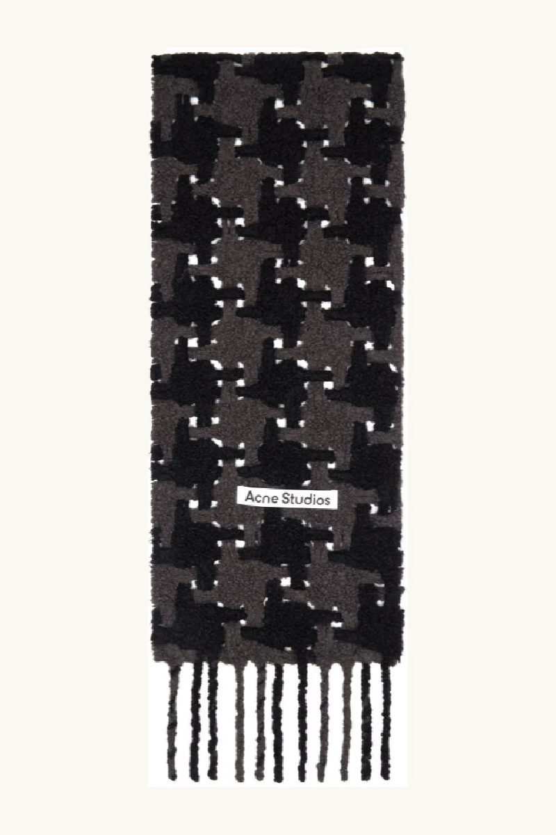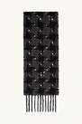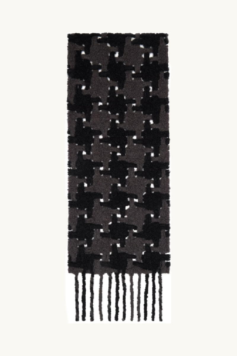 Écharpe rectangulaire en bouclé d'alpaga mélangé, noire et grise à motif pied-de-poule, écusson logo à l'avant avec des franges aux extrémités.