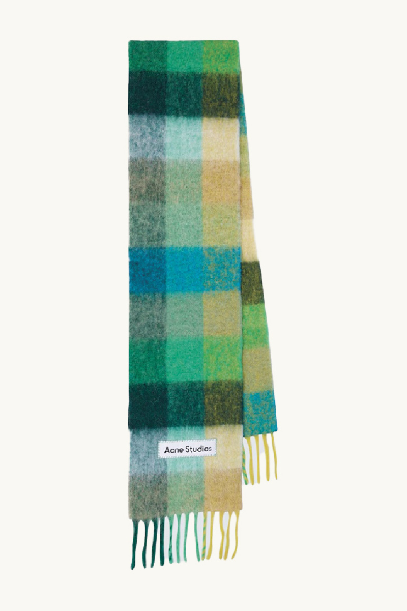 Écharpe Acne Studios, en alpaga et laine mélangés à carreaux, couleur jade et jaune, matière duveteuse, patch siglé avec logo "Acne Studios".