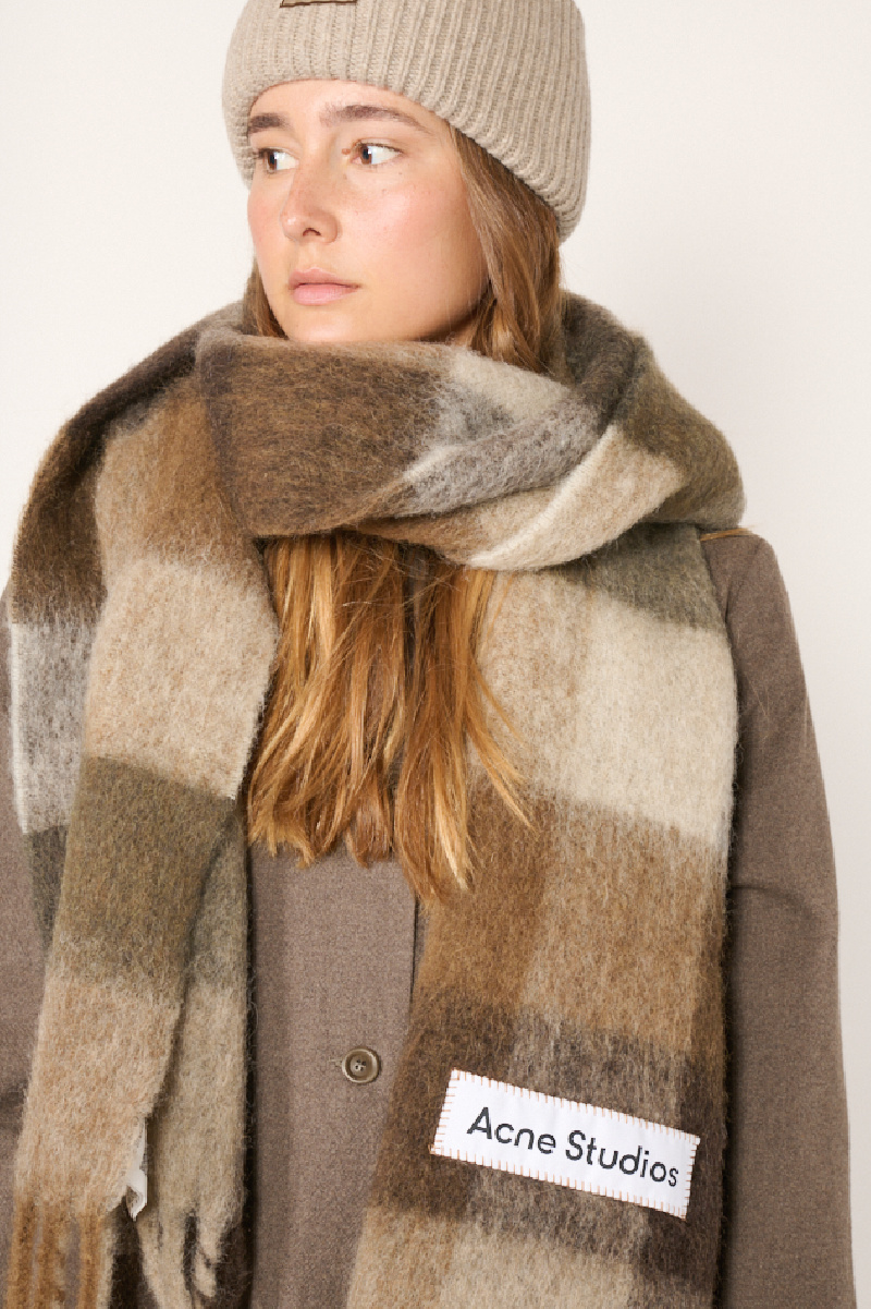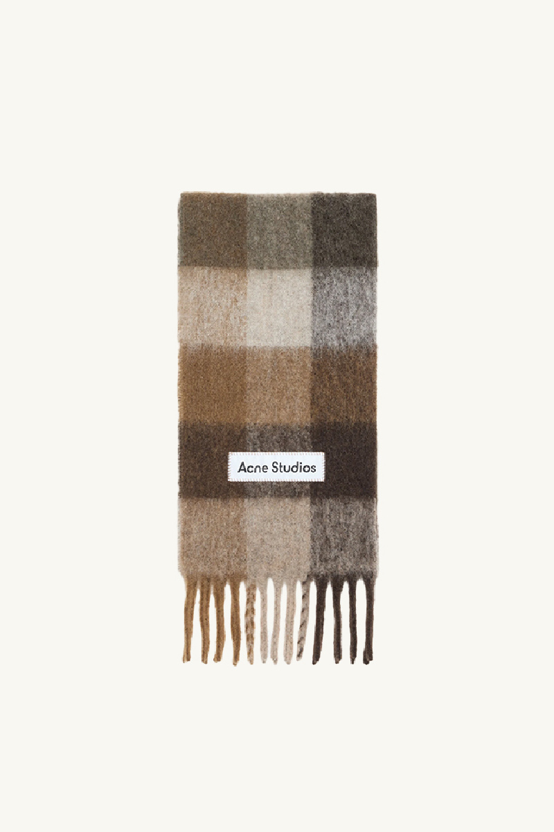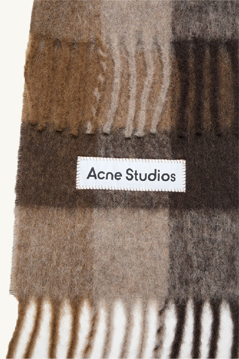 Écharpe Acne Studios, confectionnée dans un doux mélange de mohair et d'alpaga, à carreaux dans les tons marron et blanc.