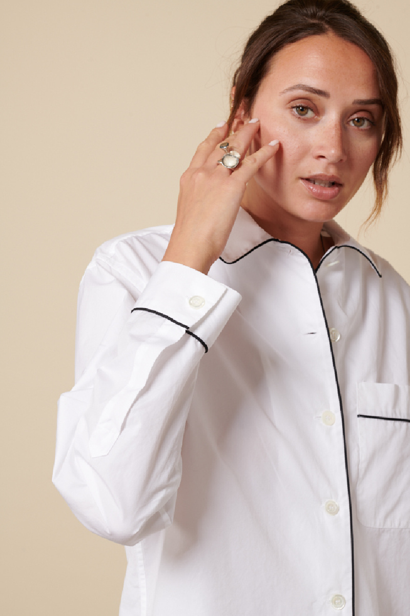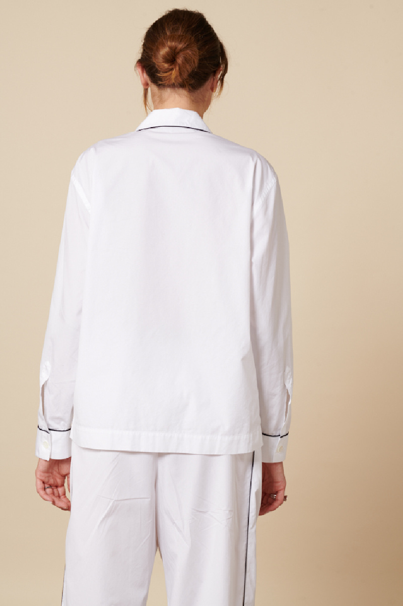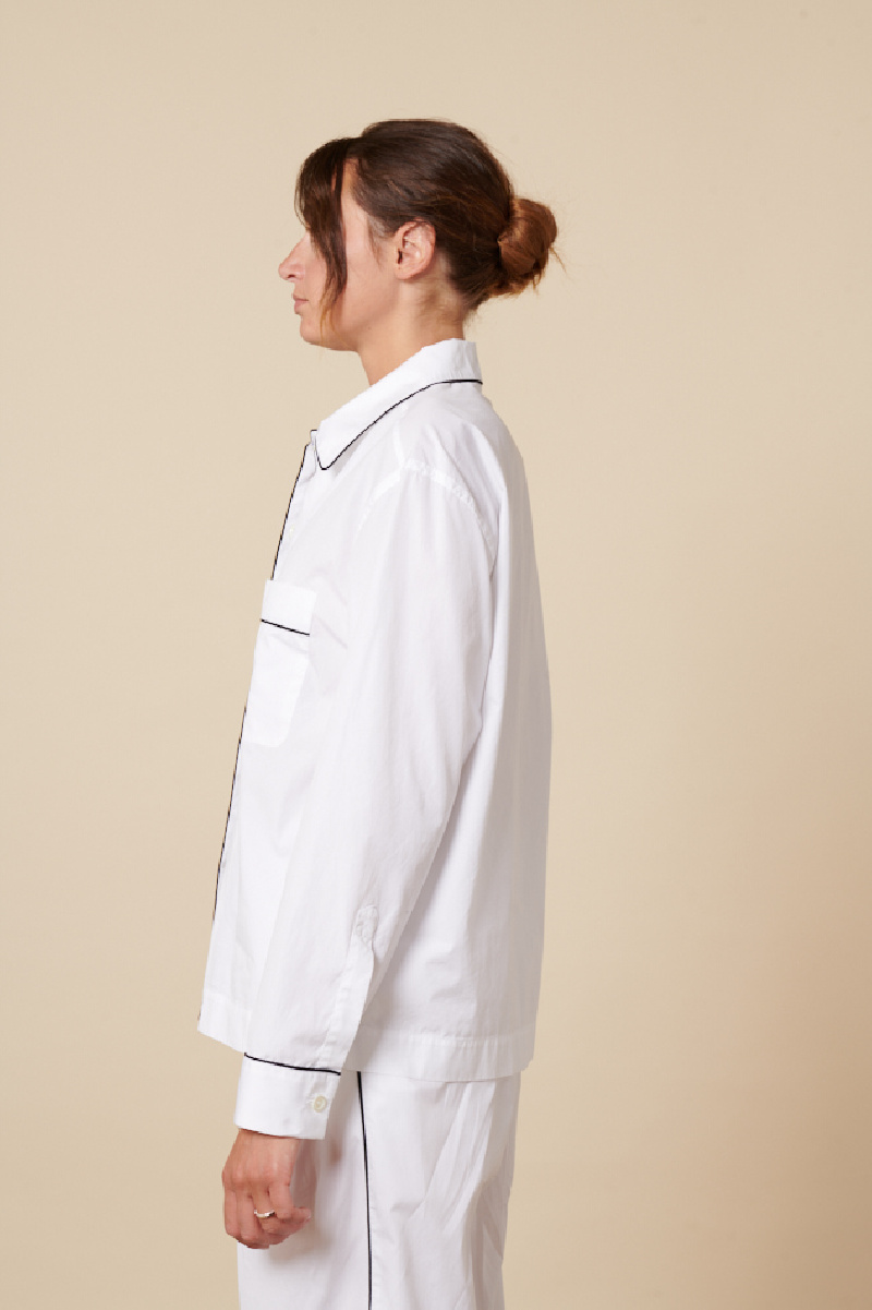 Cette chemise Ghisi, à manches longues, coupe droite, de la marque Barena, en blanc, présente une coupe droite avec un col rond, une fermeture par boutons, une poche plaquée sur le côté gauche de la poitrine, des boutons aux poignets, et un liseré noir au niveau du col, de la boutonnière et de la poche.