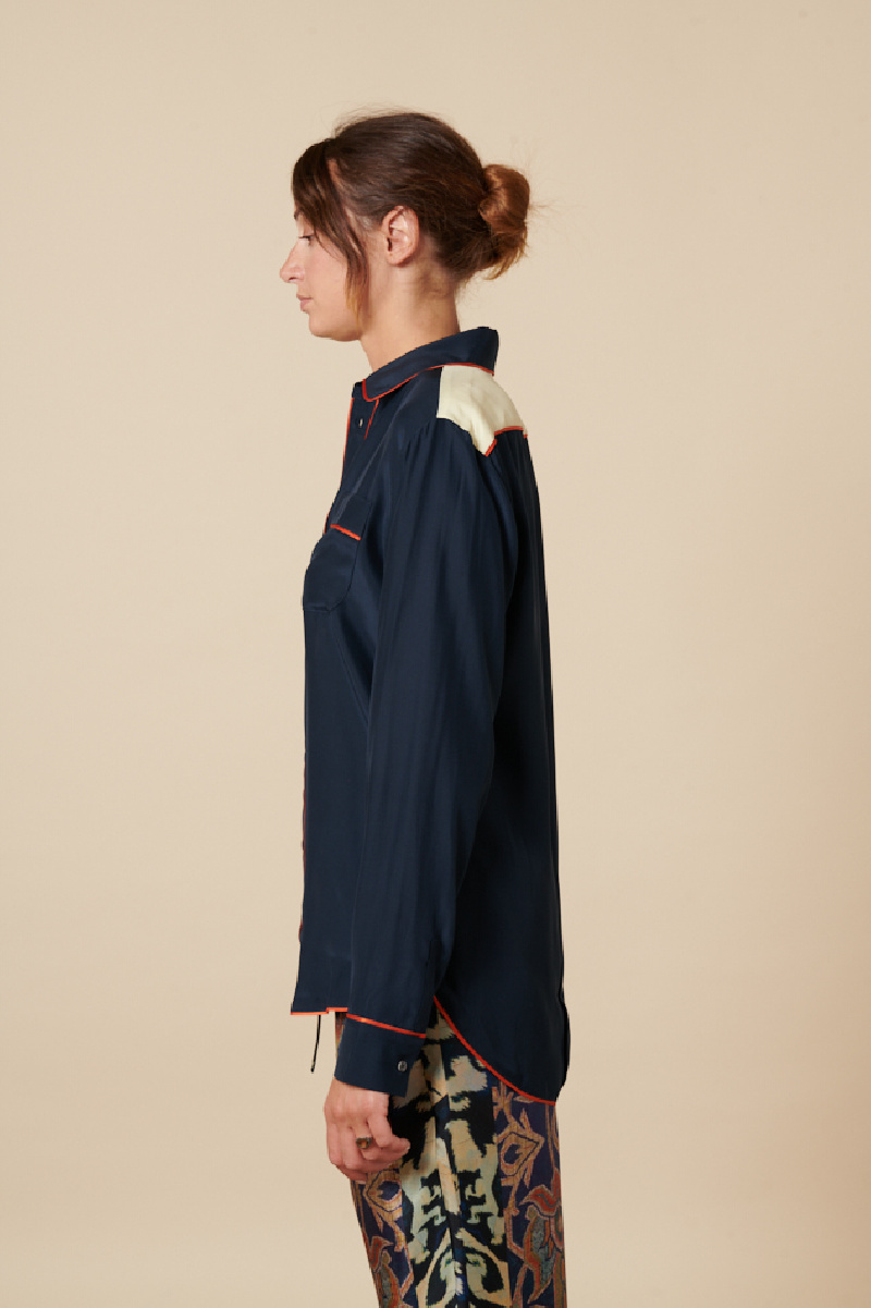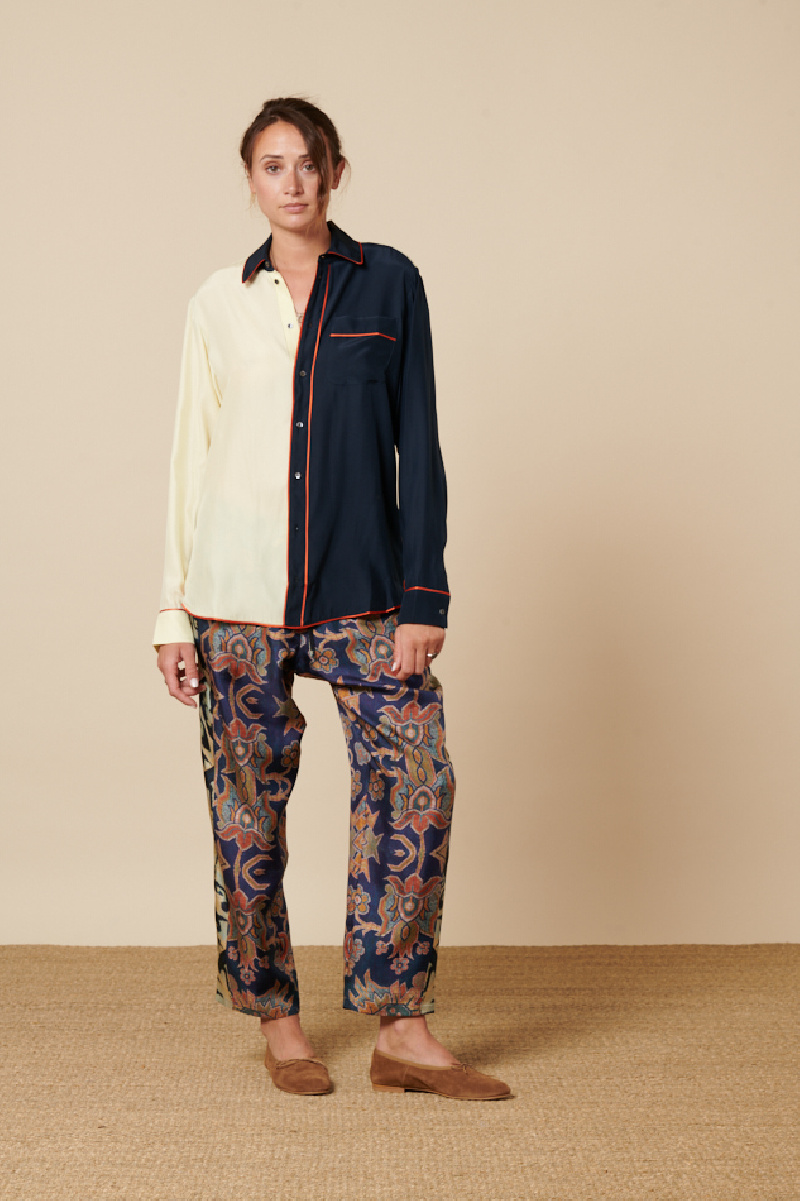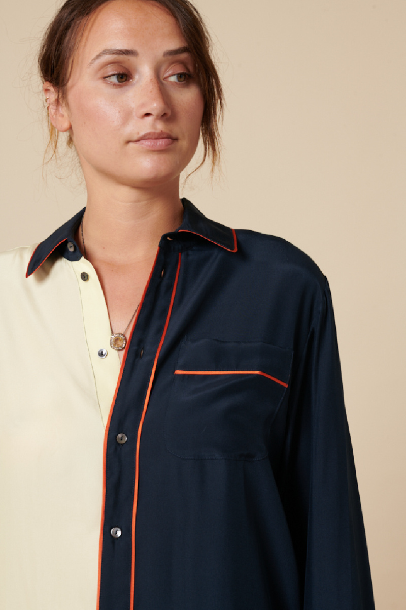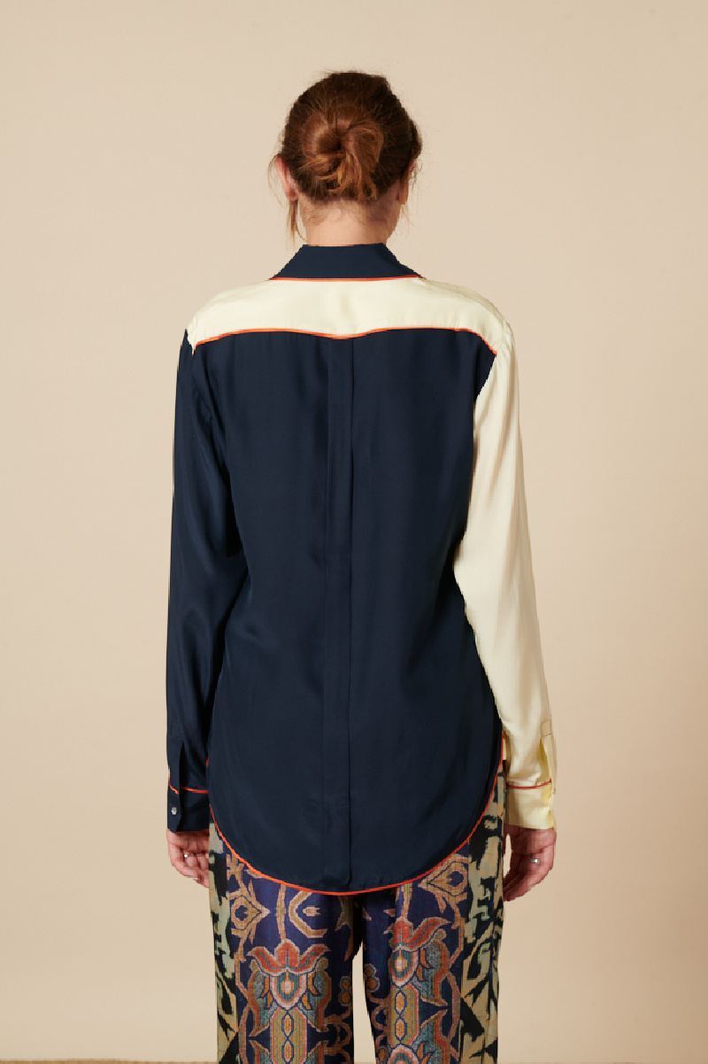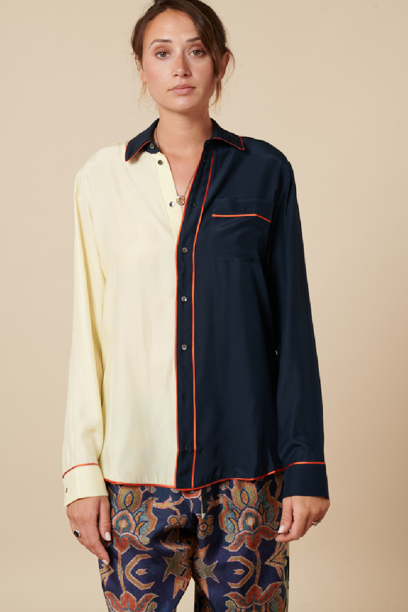 Cette chemise à manches longues, de la marque Pierre-Louis-Mascia, en satin, elle est colorée en jaune et bleu, coupe droite et légèrement plus longue sur l'arrière. La partie gauche de l'article en bleu, et la partie droite en jaune; l'arrière de la pièce est intégralement bleu, avec des détails aux extrémités sur tout l'article de liseré orange. La chemise se ferme par des boutons, comporte une poche plaquée au niveau de la poitrine côté gauche, un col rabattant bleu, et des boutons pour la fermeture aux bouts des manches.