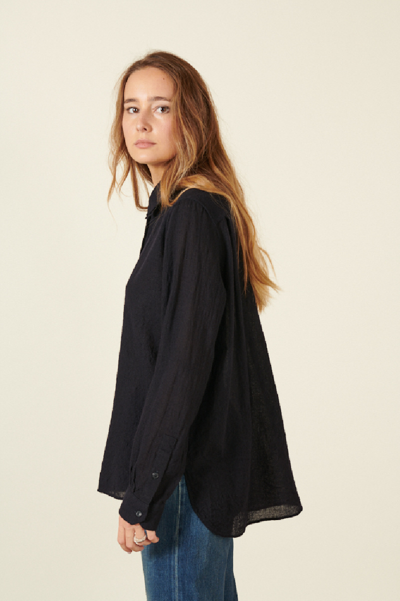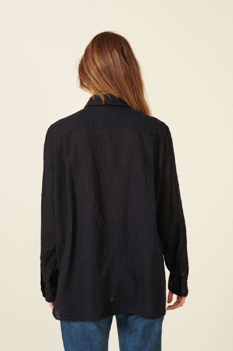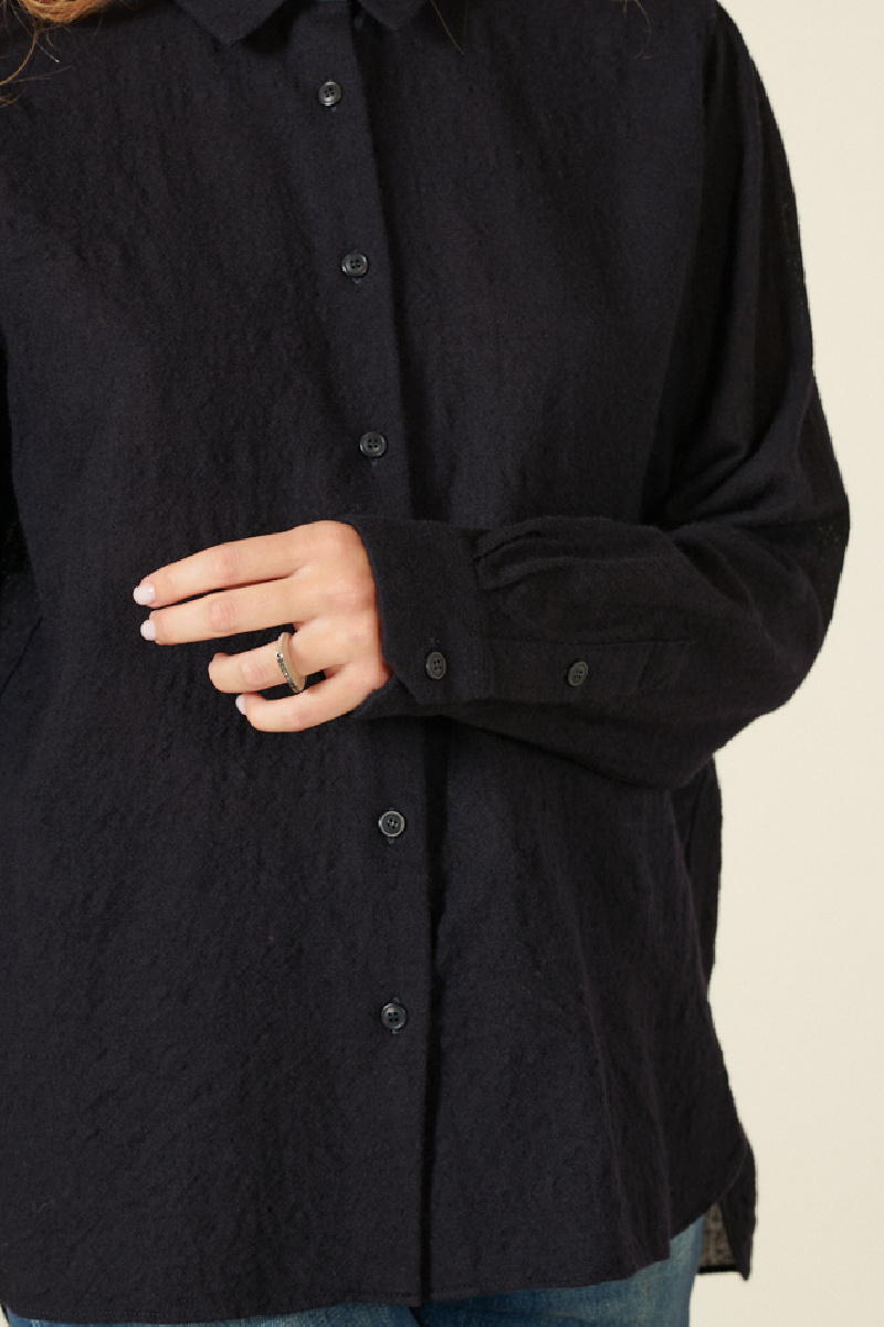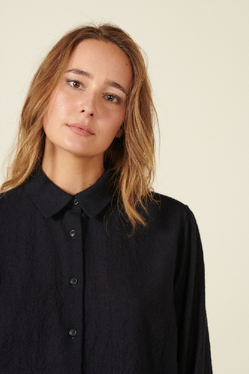 La chemise Marine de Casey Casey, en bleu marine, comporte une coupe droite et ajustée, se distingue par ses manches longues et son col classique. Elle est dotée d'une fermeture boutonnée sur le devant et est légèrement plus longue à l'arrière. Confectionnée dans un tissu de laine vierge très léger et fluide, elle offre un effet de toile ajourée.