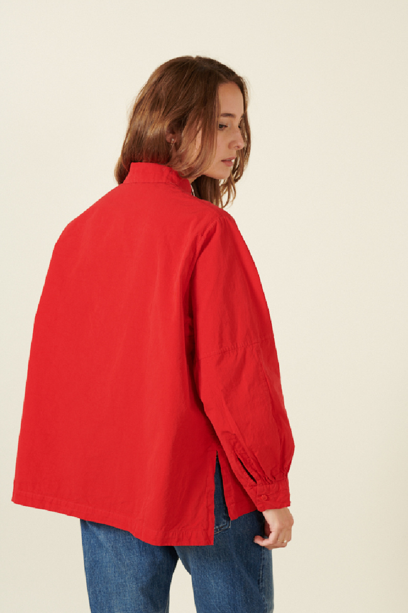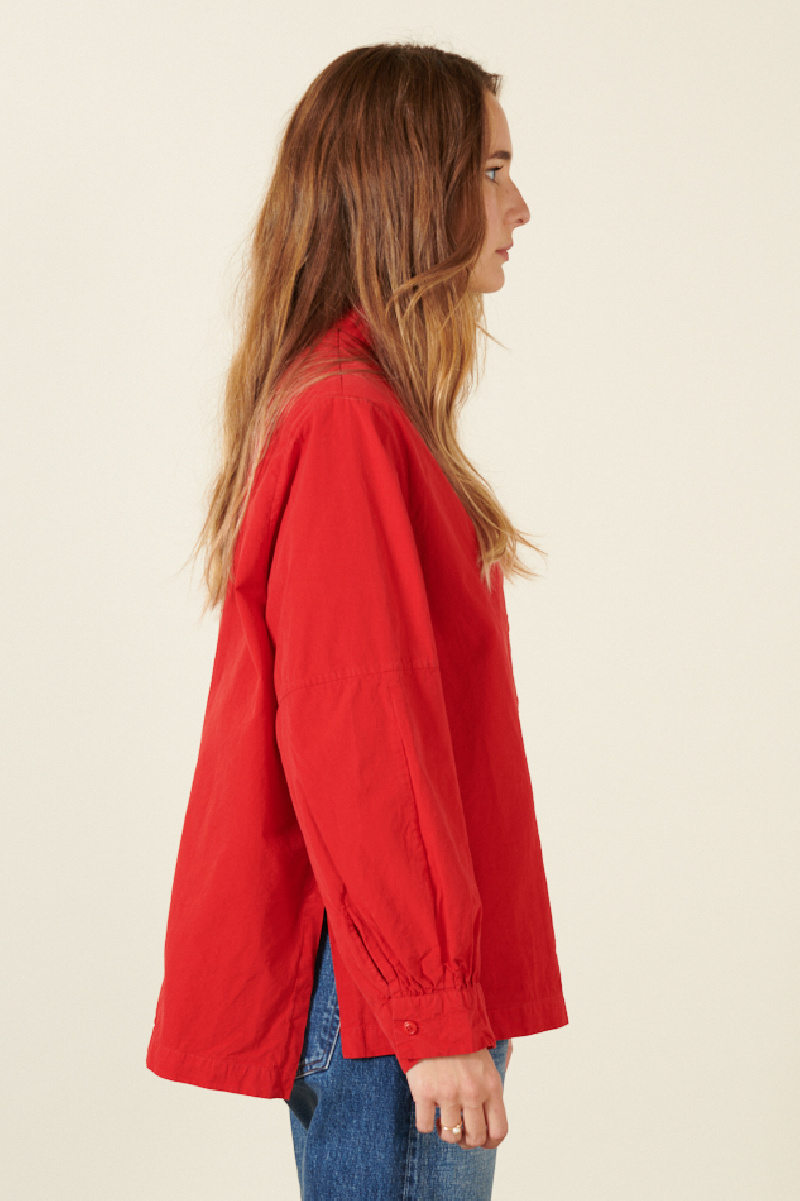 La chemise Val de Casey Casey rouge se caractérise par ses manches longues bouffantes, son col classique et sa coupe droite légèrement large. Elle est dotée d'une fermeture boutonnée sur le devant, avec des fentes latérales et une coupe asymétrique entre l'avant et à l'arrière.